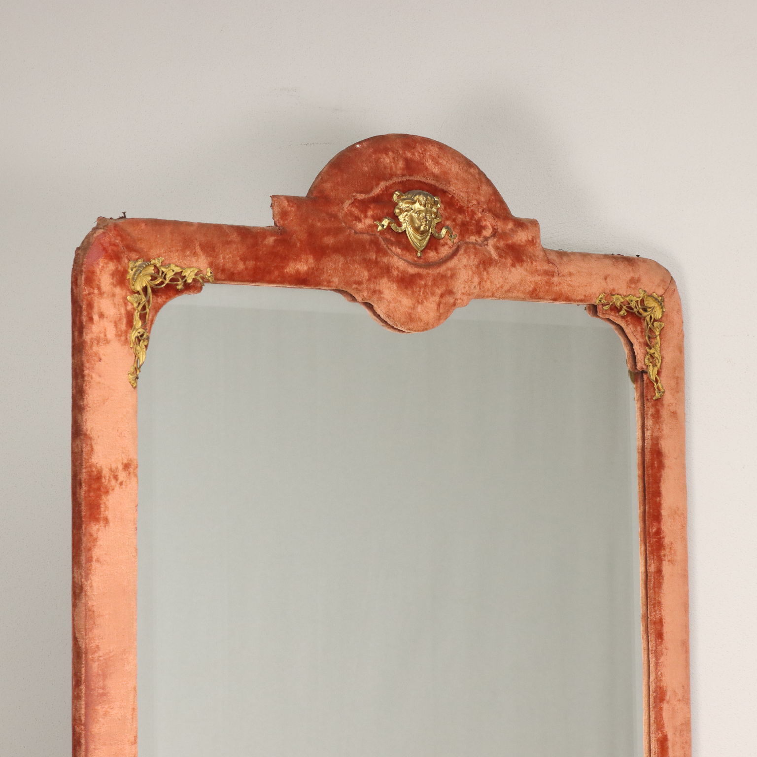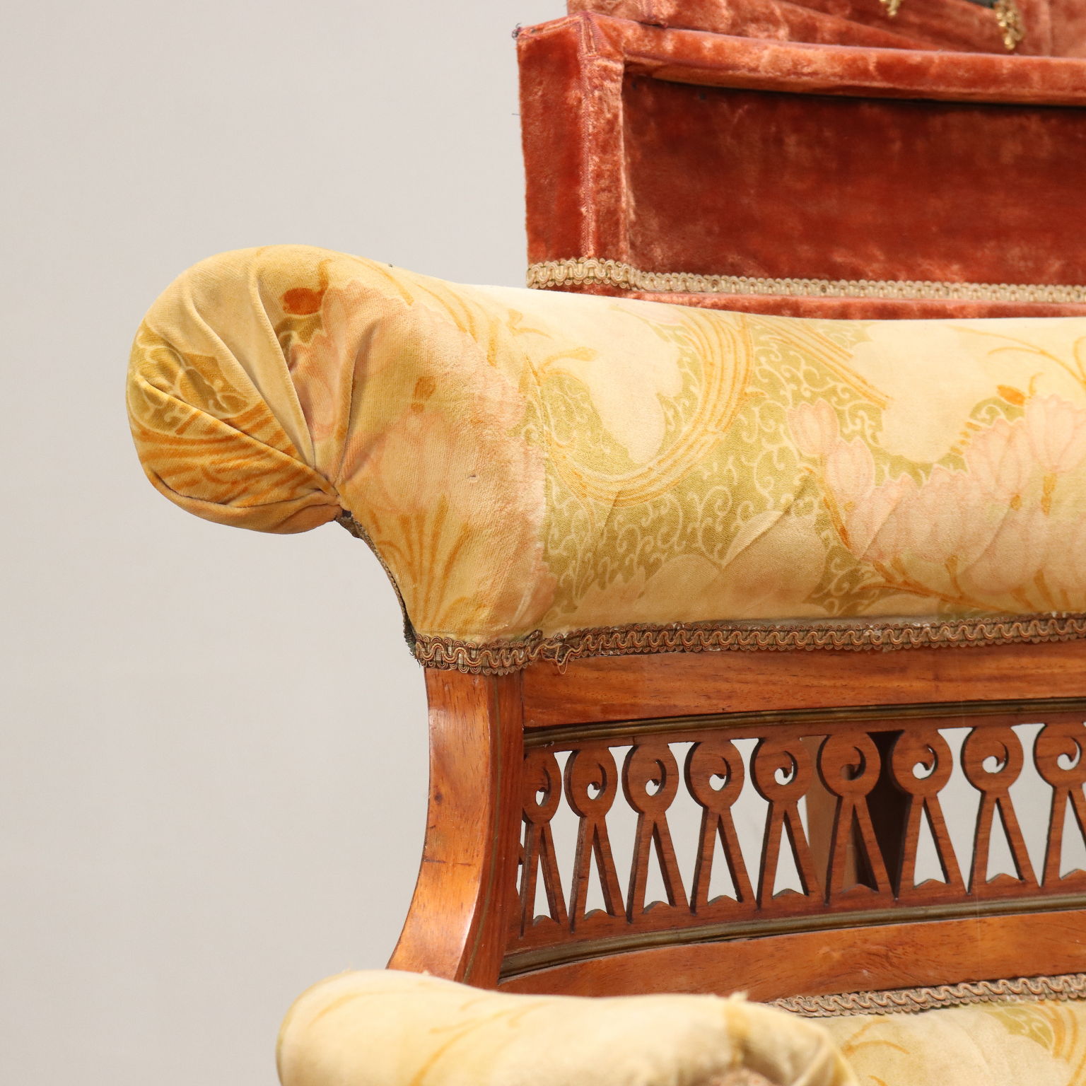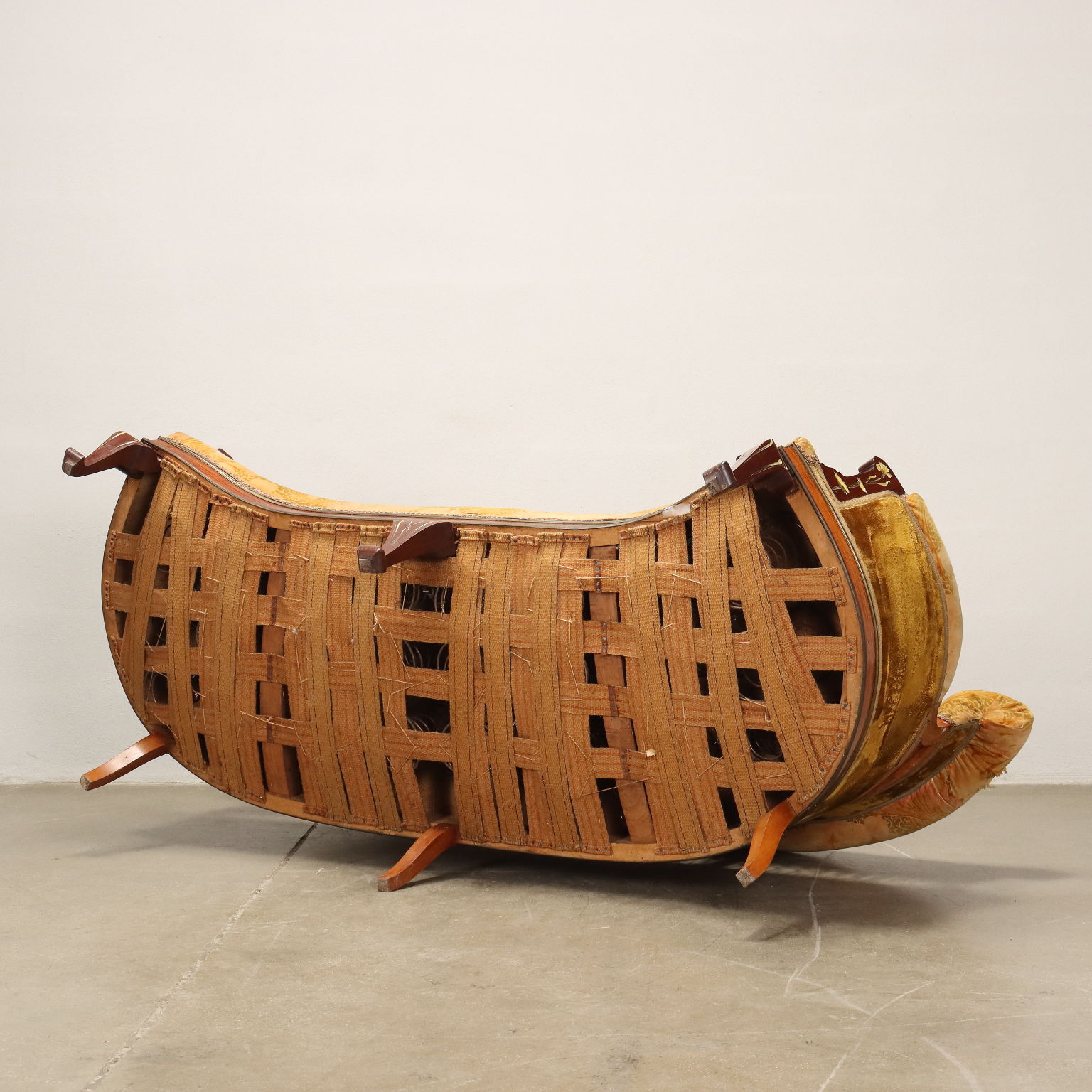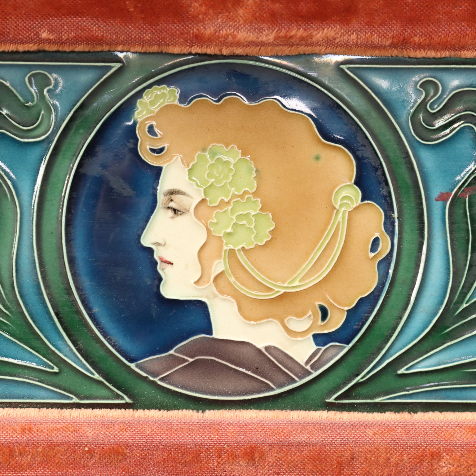 Divano d'angolo curvo con alzata con mensola e specchio. Il divano realizzato in mogano presenta piedi mossi e braccioli con intagli a "colpi di frusta" e fiori tipici rimarcati da doratura, nello schienale motivo traforato. Stoffa originale di gusto floreale. L'alzata rivestita in velluto rosso, cin specchio centrale, presenta delle formelle in ceramica viennese liberty con le tipiche figure femminili con riferimenti alla danza e musica. Decorazioni in bronzo dorato. Piccoli danni e mancanze