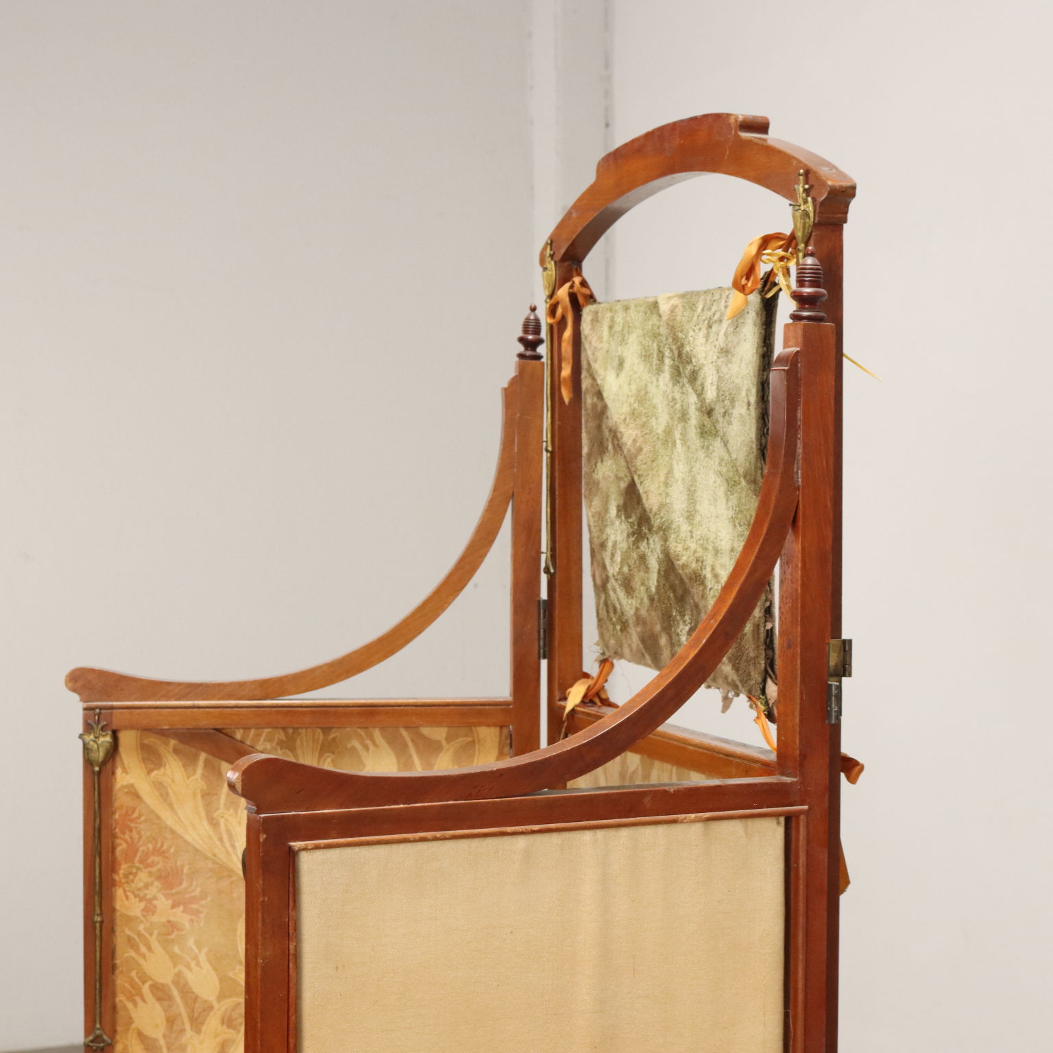 Piccolo separé a tre pannelli realizzati da leggeri telai con "colpi di frusta" contenenti un velluto a motivi liberty, due tulipani in bronzo dorato abbelliscono il pannello centrale.