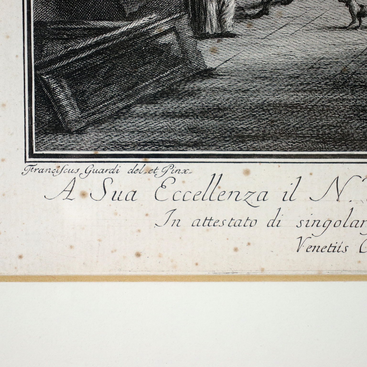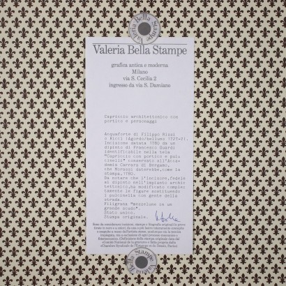 Descrizione : Capriccio con figure Acquaforte. In basso a destra il nome dell'incisore e la data di realizzazione. Come da dicitura in basso a sinistra, è ispirata ad opera di Francesco Guardi, il "Capriccio con portico e pulcinelli" conservato all'Accademia Carrara di Bergamo: l'incisore, fedele al dipinto nell'impianto architettonico, ha modificato invece completamente le figure, sostituendo i pulcinella con gente della strada. Ben conservata, la stampa è presentata in cornice.