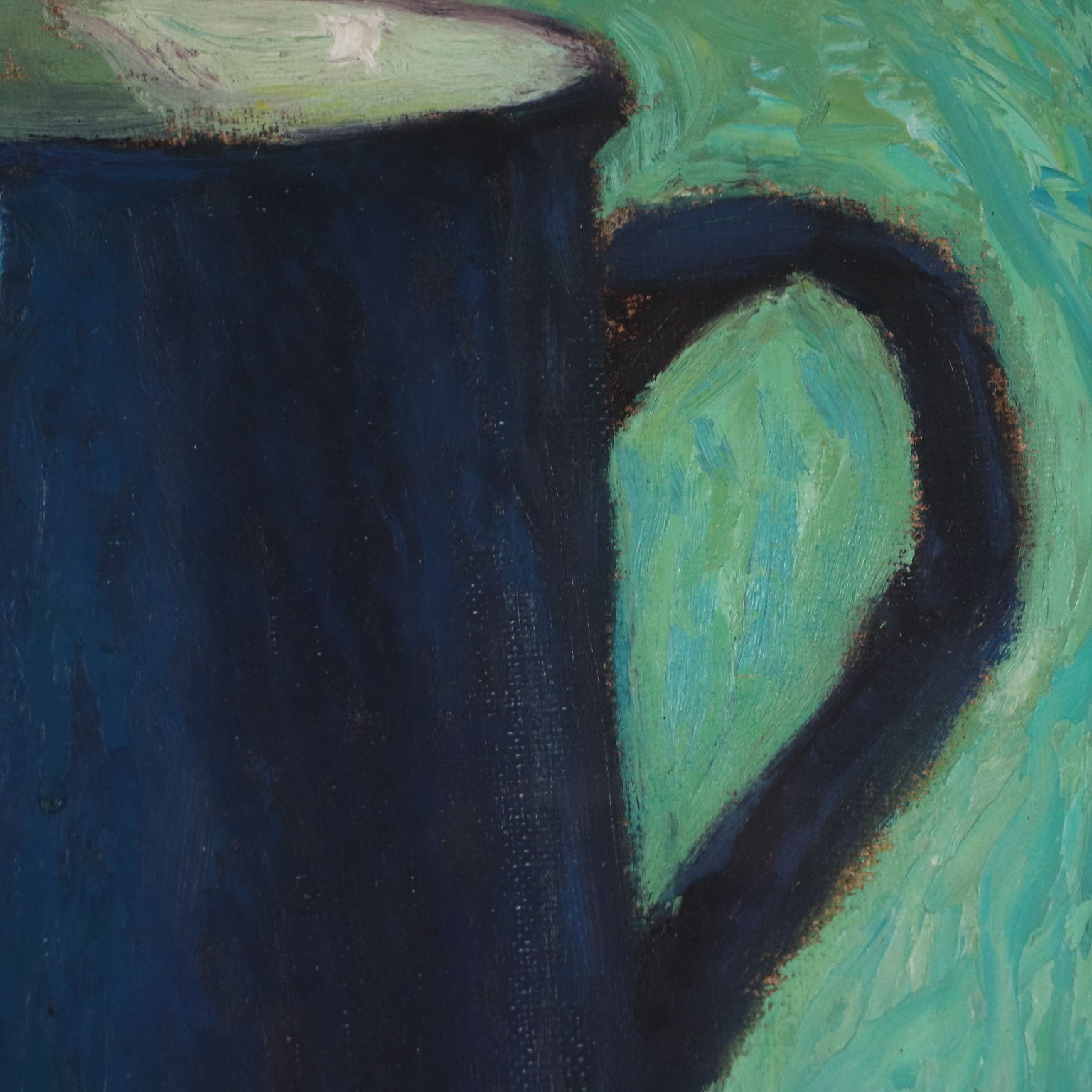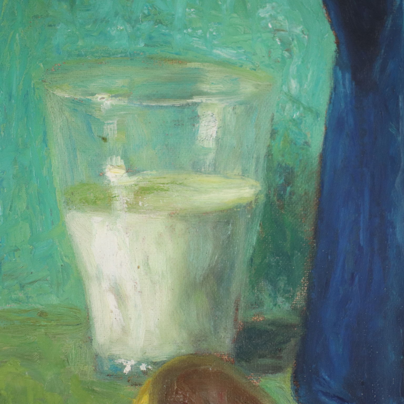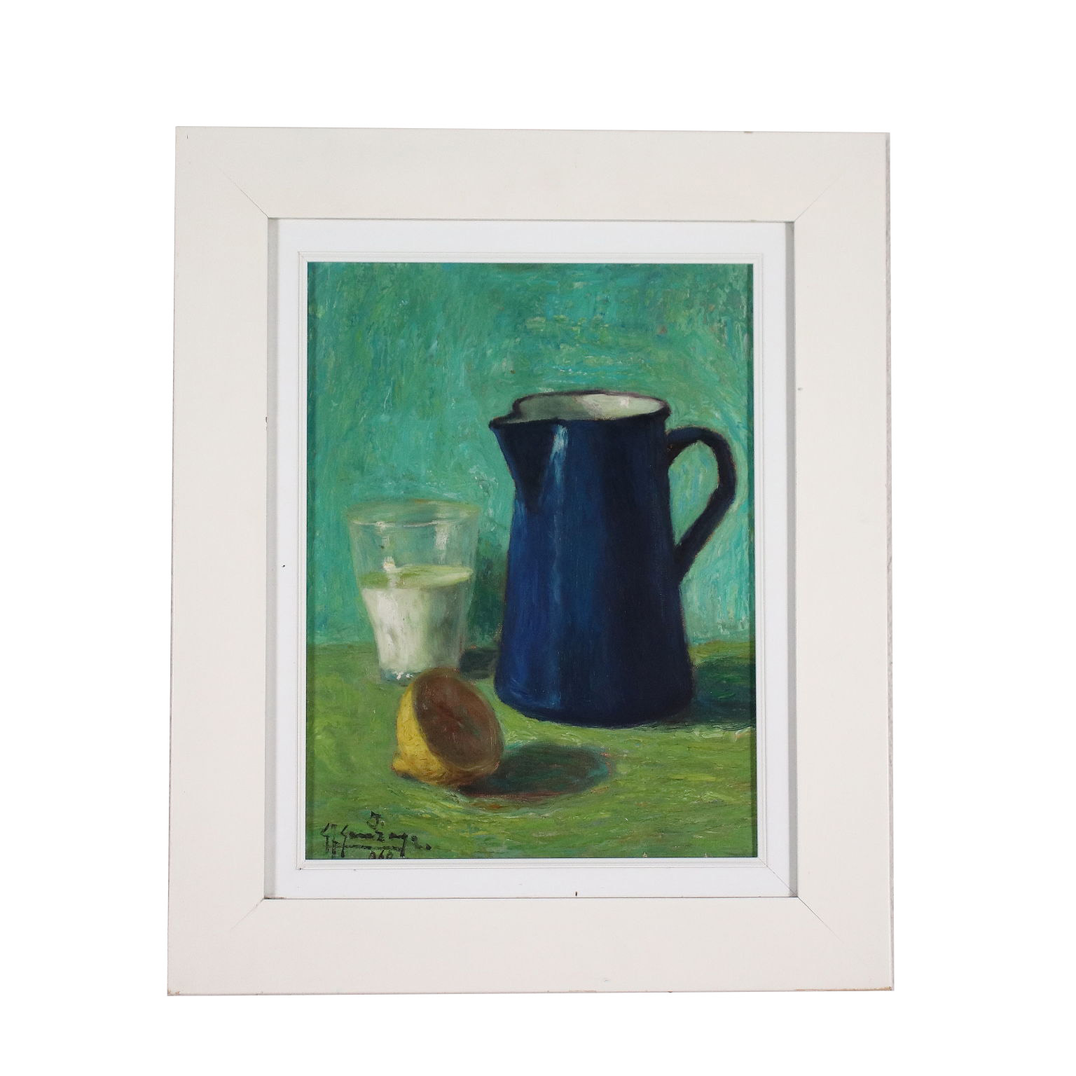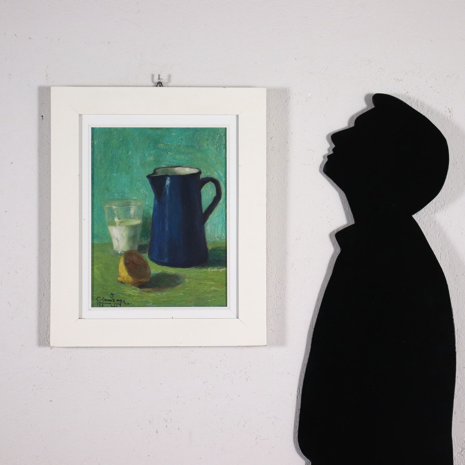 Olio su tela. Firmato e datato in basso a sinistra. Al retro ulteriore firma, data e il titolo. Artista milanese discendente da un ramo cadetto dei nobili Gonzaga mantovani, Giovan Francesco prese parte ancora ventenne alla Seconda Guerra Mondiale con il Savoia Cavalleria partecipando, con lo squadrone “Fantasma” ad azioni di pattuglia nella steppa russa. I mesi passati a strettissimo contatto con il cavallo durante la guerra, accesero in lui una vera e propria passione per i cavalli, che divennero soggetto privilegiato di numerosissimi dipinti, sculture e poesie. Artista autodidatta, dichiarò "la mia vera maestra è la Natura", e ad essa fedele, dopo i cavalli, si dedicò prevalentemente ai paesaggi e alle nature morte, sempre raffigurati “en plein air”. Ha scritto di lui Vittorio Sgarbi: "La sapienza di Giovan Francesco Gonzaga sta nel disegno, che è forte e deciso..... Le immagini vibrano di inquietudine, nel segno della lotta dell'uomo contro se stesso, nell'inferno di una storia che sembra ripetere sempre lo stesso dramma. Ma se il disegno preparatorio è mirabile, il colore di questo artista ha una regalità e una sensibilità che provengono da una percezione musicale della cromia, dove la tavolozza si esprime in improvvisi, in variazioni e in ritmi pulsanti". Le sue opere figurano in diversi musei, fra cui quello della Cavalleria di Pinerolo, il Museo Storico della Guardia di Finanza a Roma, il Museo di Tel Aviv, L'Art Museum di Los Angeles, in collezioni pubbliche e private in Italia, Francia, Spagna, Lussemburgo, Indonesia, Cina, Giappone, Singapore e America. In questa natura morta si esaltano soprattutto i cromatismi: i tre elementi - la coccoma blu, ovvero una brocca smaltata, un limone tagliato e un bicchiere di latte -, ben distanziati tra loro e proposti in colori contrastanti, spiccano sulle due tonalità dei verde dello sfondo. L'opera è presentata in cornice.