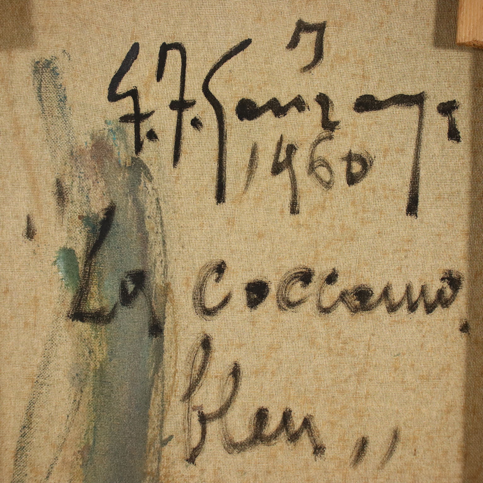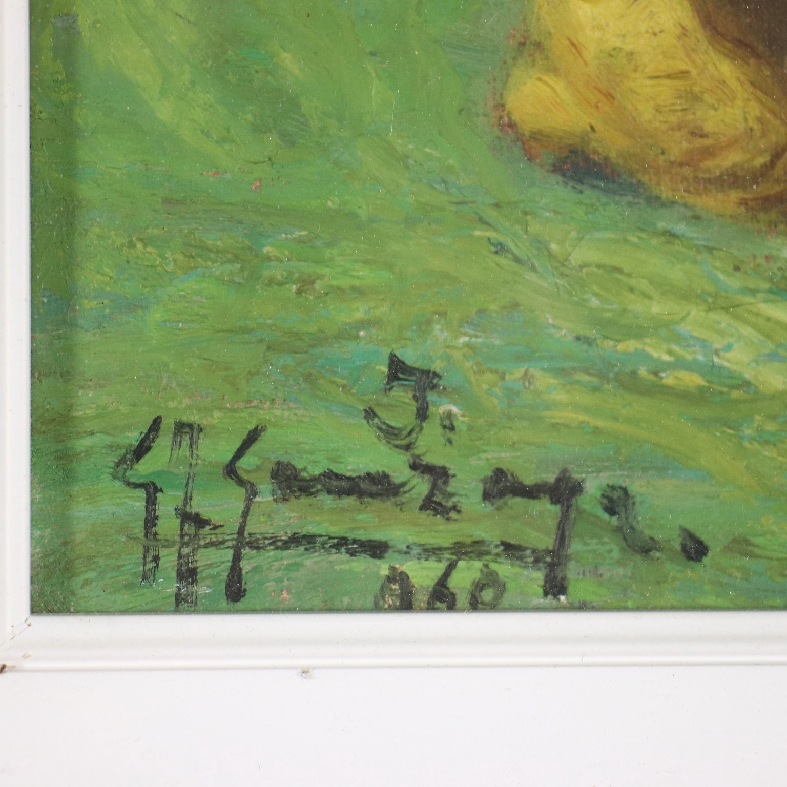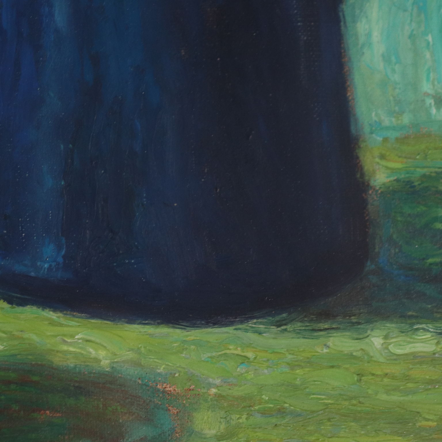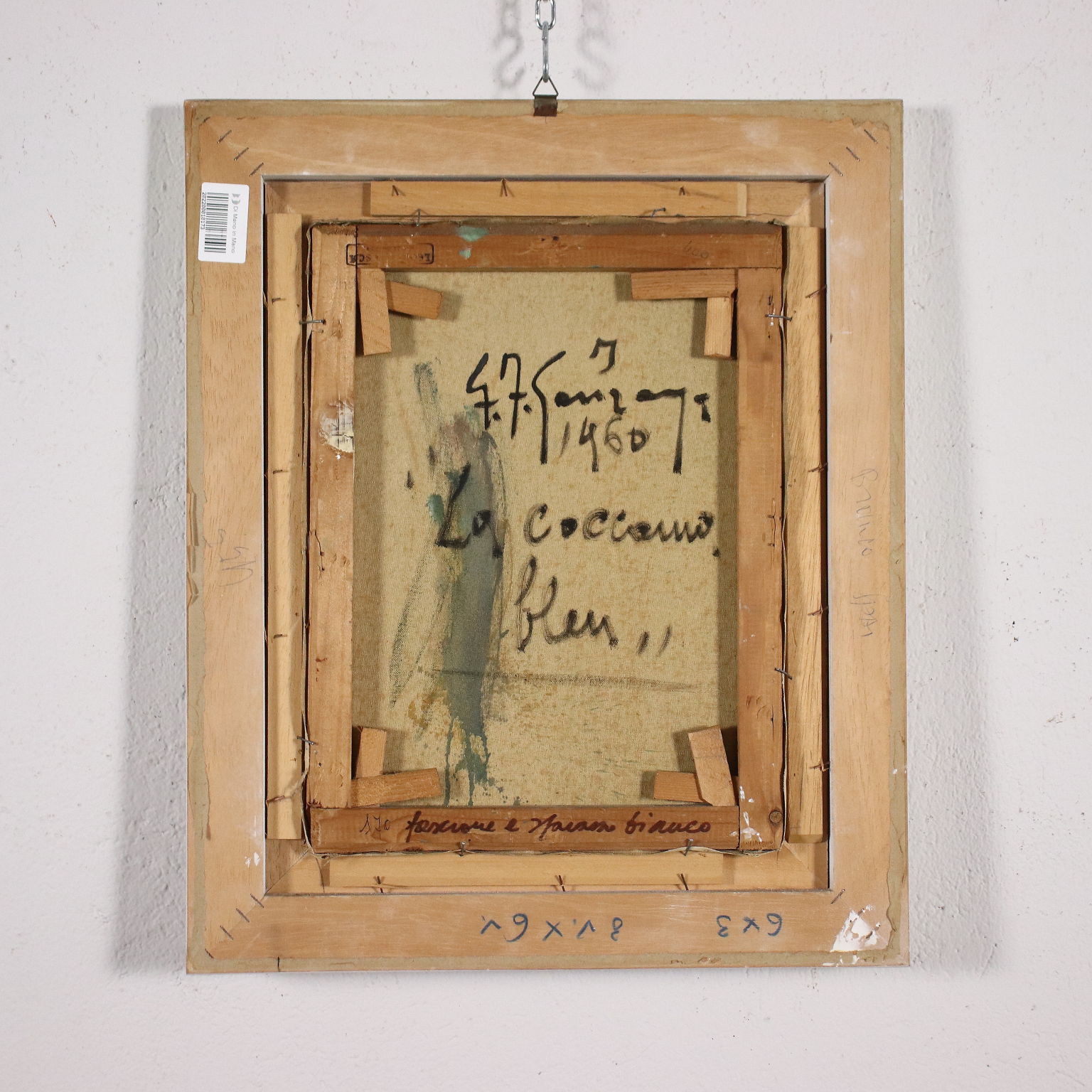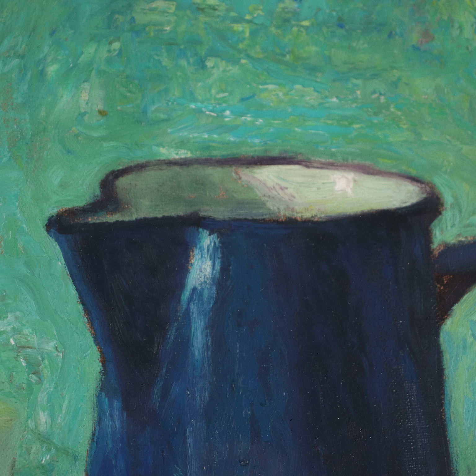 Olio su tela. Firmato e datato in basso a sinistra. Al retro ulteriore firma, data e il titolo. Artista milanese discendente da un ramo cadetto dei nobili Gonzaga mantovani, Giovan Francesco prese parte ancora ventenne alla Seconda Guerra Mondiale con il Savoia Cavalleria partecipando, con lo squadrone “Fantasma” ad azioni di pattuglia nella steppa russa. I mesi passati a strettissimo contatto con il cavallo durante la guerra, accesero in lui una vera e propria passione per i cavalli, che divennero soggetto privilegiato di numerosissimi dipinti, sculture e poesie. Artista autodidatta, dichiarò "la mia vera maestra è la Natura", e ad essa fedele, dopo i cavalli, si dedicò prevalentemente ai paesaggi e alle nature morte, sempre raffigurati “en plein air”. Ha scritto di lui Vittorio Sgarbi: "La sapienza di Giovan Francesco Gonzaga sta nel disegno, che è forte e deciso..... Le immagini vibrano di inquietudine, nel segno della lotta dell'uomo contro se stesso, nell'inferno di una storia che sembra ripetere sempre lo stesso dramma. Ma se il disegno preparatorio è mirabile, il colore di questo artista ha una regalità e una sensibilità che provengono da una percezione musicale della cromia, dove la tavolozza si esprime in improvvisi, in variazioni e in ritmi pulsanti". Le sue opere figurano in diversi musei, fra cui quello della Cavalleria di Pinerolo, il Museo Storico della Guardia di Finanza a Roma, il Museo di Tel Aviv, L'Art Museum di Los Angeles, in collezioni pubbliche e private in Italia, Francia, Spagna, Lussemburgo, Indonesia, Cina, Giappone, Singapore e America. In questa natura morta si esaltano soprattutto i cromatismi: i tre elementi - la coccoma blu, ovvero una brocca smaltata, un limone tagliato e un bicchiere di latte -, ben distanziati tra loro e proposti in colori contrastanti, spiccano sulle due tonalità dei verde dello sfondo. L'opera è presentata in cornice.