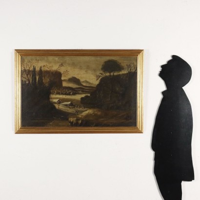 Olio su tela. Scuola nord-europea del XIX secolo. Un ampio paesaggio a ridosso di rilievi scoscesi, vede nella vallata scorrere un fiume largo, animato da chiatte e figure popolari intente a diverse attività. Il paesaggio e la tipologia pittorica, in particolare le scelte cromatiche brune e cupe, rimandano ai paesi del Nord-Europa. La tela presenta segni di rattoppi al retro. E' presentata in cornice in stile.
