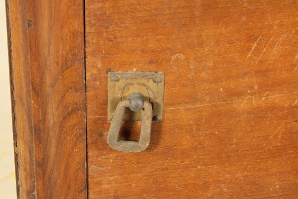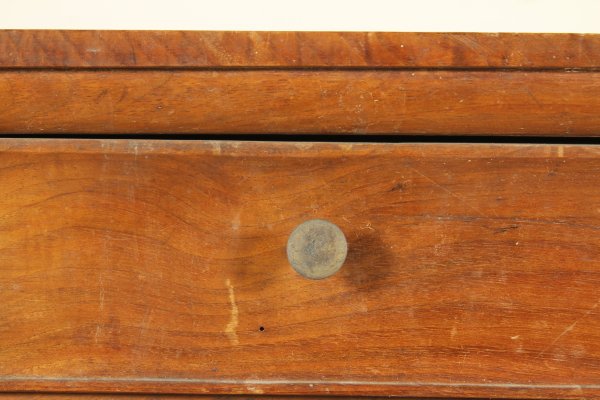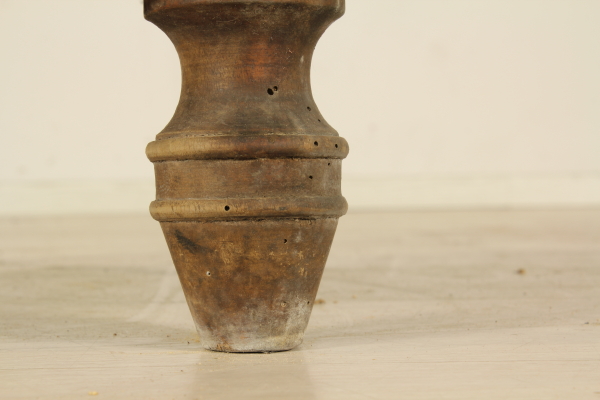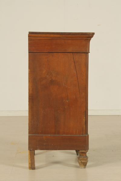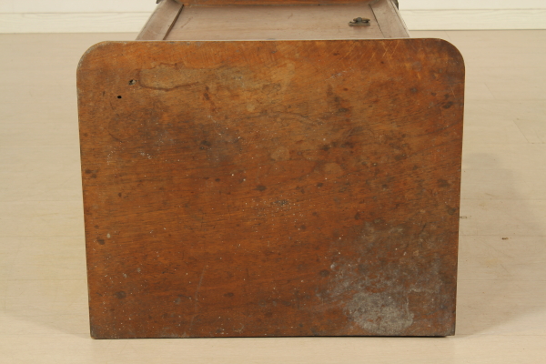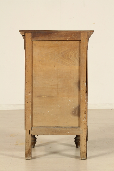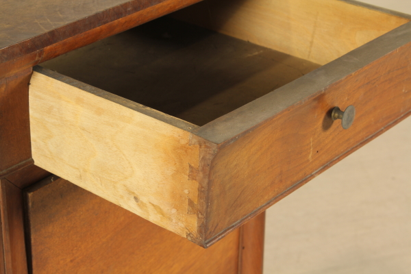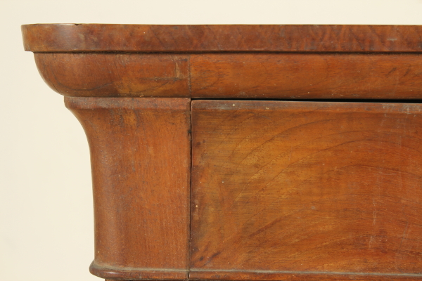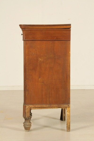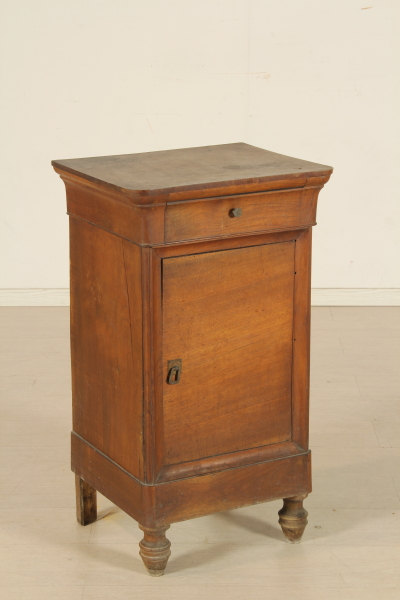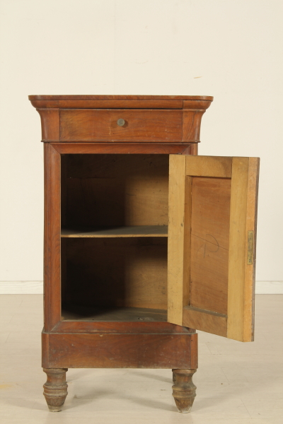 Retto da piedi a vasetto torniti, presenta un anta e un cassetto a "gola di tulipano" linee presenti anche sui fianchi nella fascia sotto-piano. L'anta è racchiusa da cornicetta. Piano sagomato.