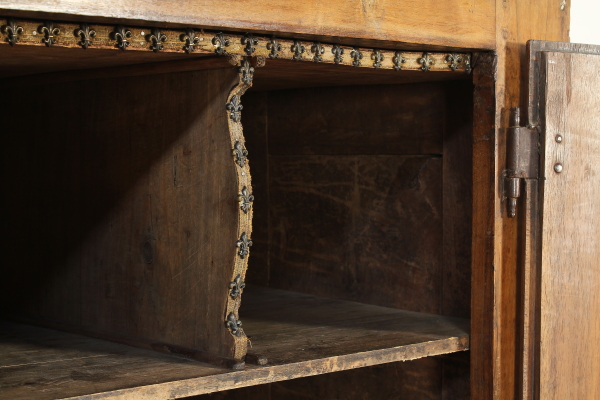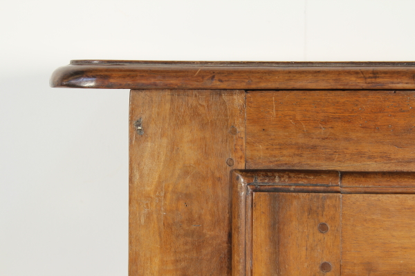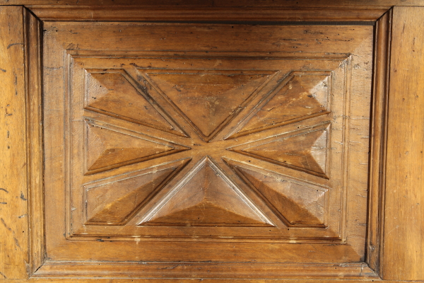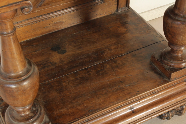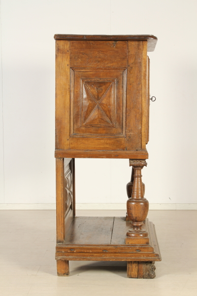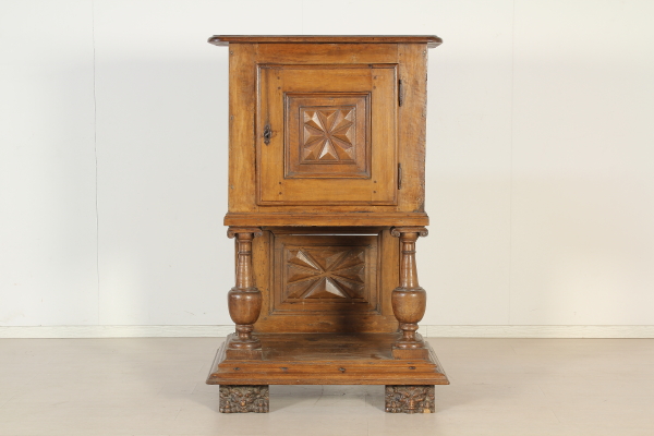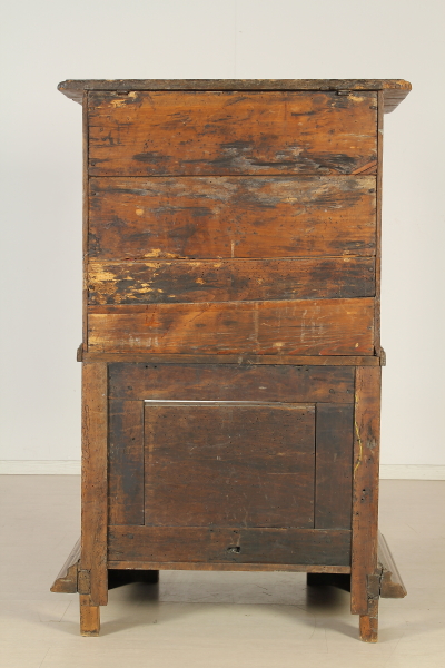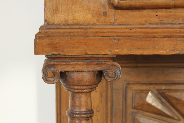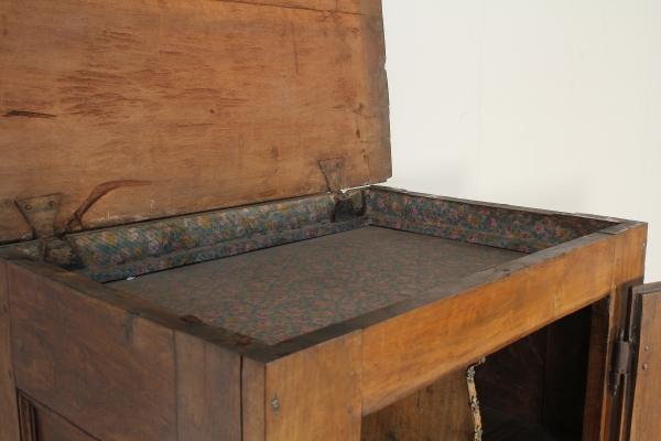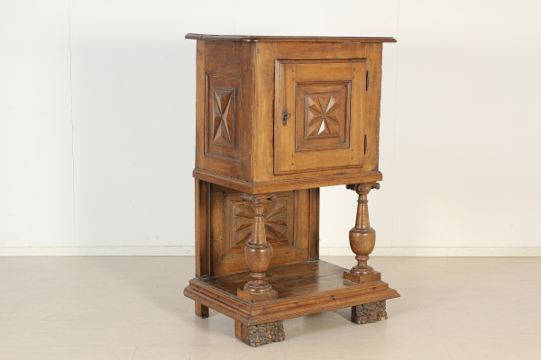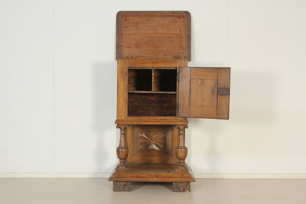 Retto da colonne tornite con capitelli intagliati poggianti su basamento retto da piedi intagliati a mascheroni. Presenta anta e piano apribile a ribalta. Sull'anta e sui fianchi intagli a punta di diamante. Riadattato e modificato nelle misure ha subito restauri.