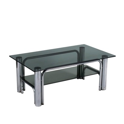 Tavolino da centro con doppio piano, metallo cromato, piani in vetro fumè.