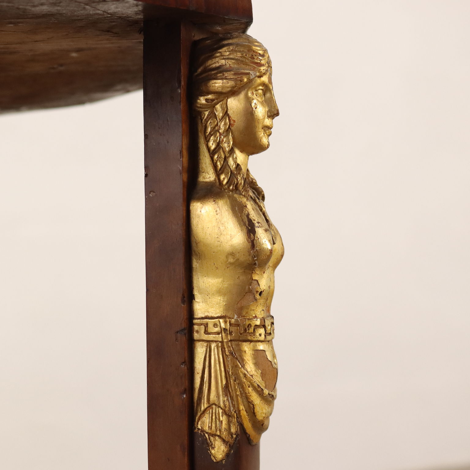 Gueridon impero lastronato in noce, lombardia primo quarto XIX secolo. Piano dodecagonale, fascia sottopiano con profilo in lamierino applicato e 4 cassetti, montanti con lesene a cariatidi dorate poggianti su basamento a semicolonna in legno dorato. Base a plinto sagomata poggiante su piedi ferini in legno intagliato e dorato. Interni in noce.
