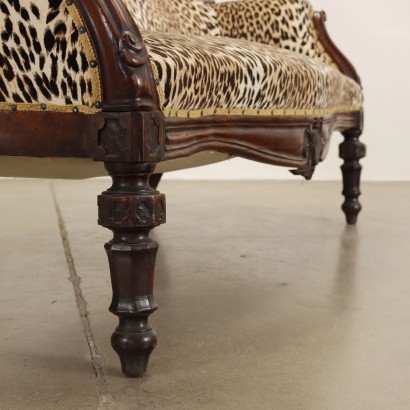 Divano Luigi Filippo in noce, Italia metà XIX secolo. Parte superiore schienale abbellita da intagli di gusto rocaille, ripresi anche al centro del grembiale, gambe tornite e intagliate terminanti con piedi a trottola. Schienale e seduta imbottiti.