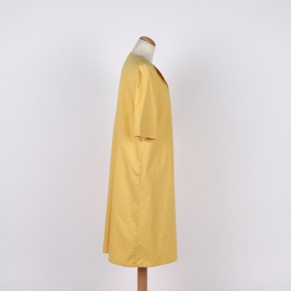 Caftano, con due tasche, in leggero cotone giallo intenso, dal taglio morbido e svasato, con cuciture ton sur ton a vista sulle maniche, scollo e sul taglio sotto il seno.