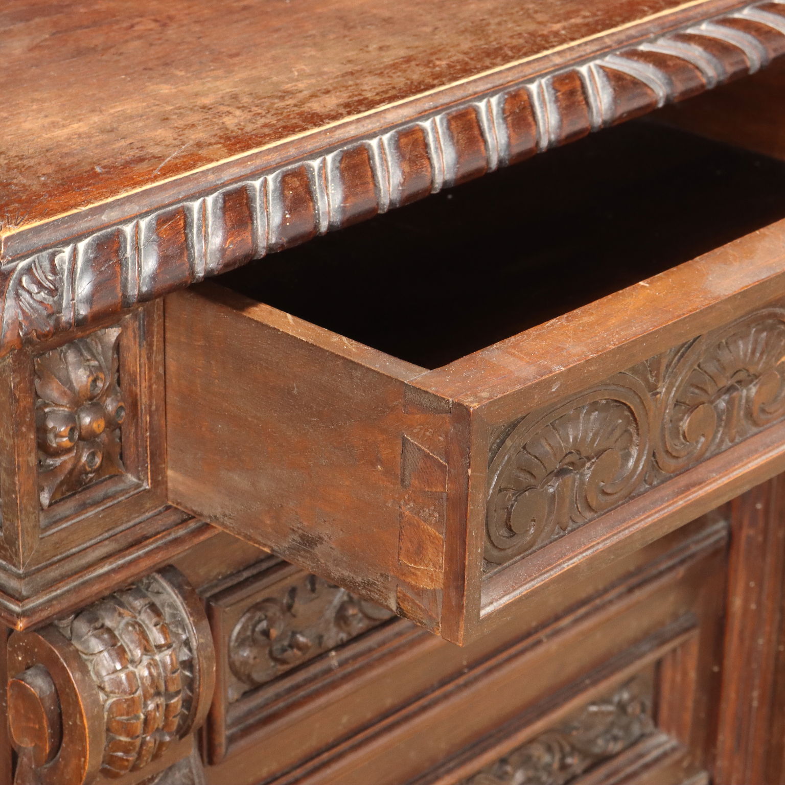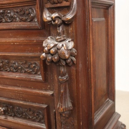 Coppia di comodini neorinascimento sorretti da piedini a mensola, sul fronte presentano tre cassetti più uno posto nella fascia sottopiano. In noce, sono riccamente ornati da intagli di gusto neorinascimentale, come rosoni, motivi fogliacei nelle riserve di cassetti e festoni di frutta nei montanti.