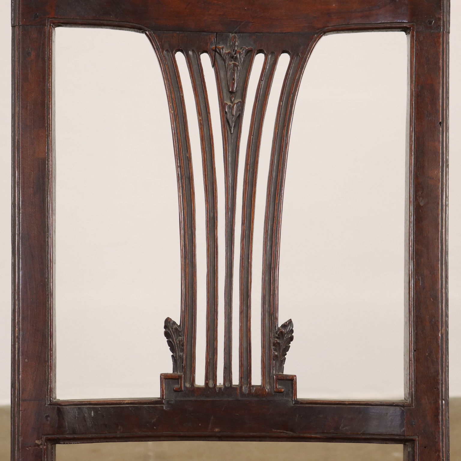 Coppia di sedie neoclassiche sorrette da gambe tronco-coniche rudentate strette da un collare nella parte superiore, la seduta è incannucciata, mentre lo schienale è a giorno; in noce.