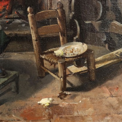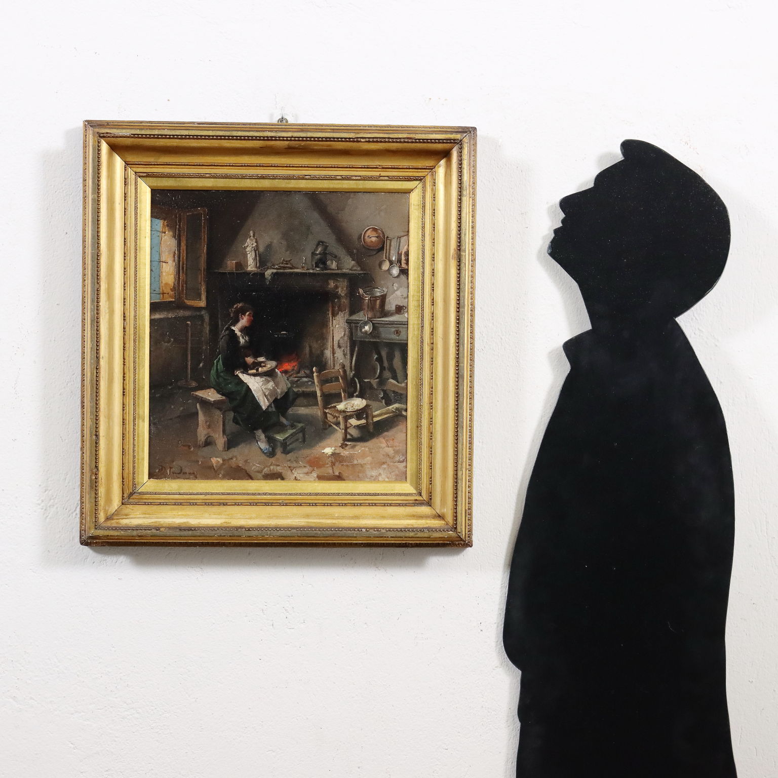 Olio su tela applicata a cartone. Firmata in basso a sinistra. Corredata di autentica su foto della Collezione Orler. All'interno di un'abitazione popolare, corredata di attrezzi da cucina, una giovane donna è seduta davanti al camino acceso, intenta a mondare della verdura; dalla finestra in alto a sinistra entra la luce di una giornata luminosa e chiara, che si irradia nella cucina grigia e povera. L'opera ben rientra nella produzione di Domenico Induno, il pittore milanese allievo di Francesco Hayez, che dopo gli esordi dedicati prevalentemente alla pittura a soggetto storico -risorgimentale, dagli anni '50 volse la sua produzione verso le scene di genere, ambientate in interni domestici e con protagonisti poveri e derelitti. Scene intime, spesso con pochi personaggi, virate in una tonalità emotiva malinconica e dimessa, talora perfino desolata, che però venivano animate pittoricamente da quella pennellata rapida e guizzante, da quel tocco mobile e brillante, che sempre più avrebbero caratterizzato lo stile dell'Induno. Egli conseguì grande successo con la sua produzione, che gli avvalse numerosi riconoscimenti e un seguito tra i pittori più giovani. Fu anche affermato ritrattista. L'opera è presentata in cornice in stile.