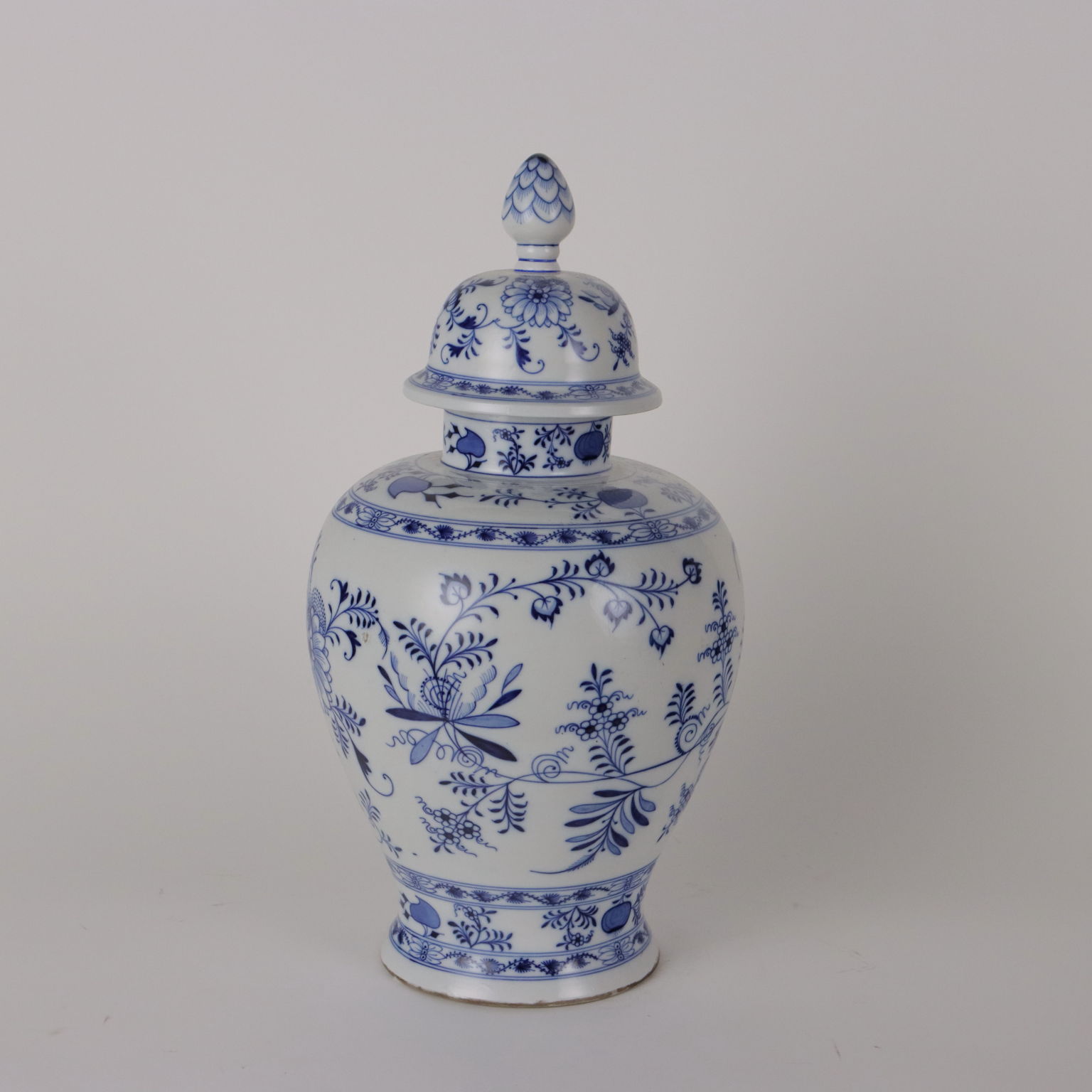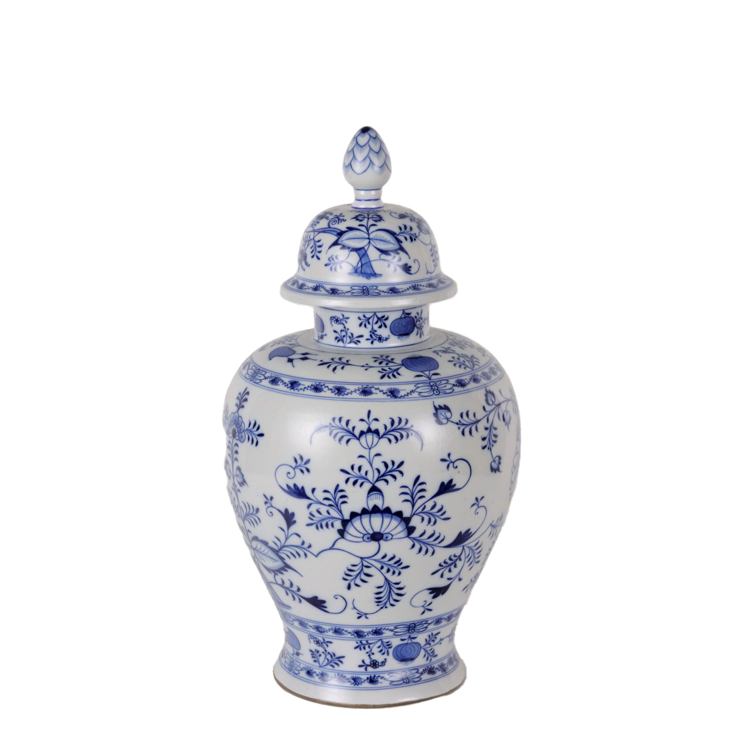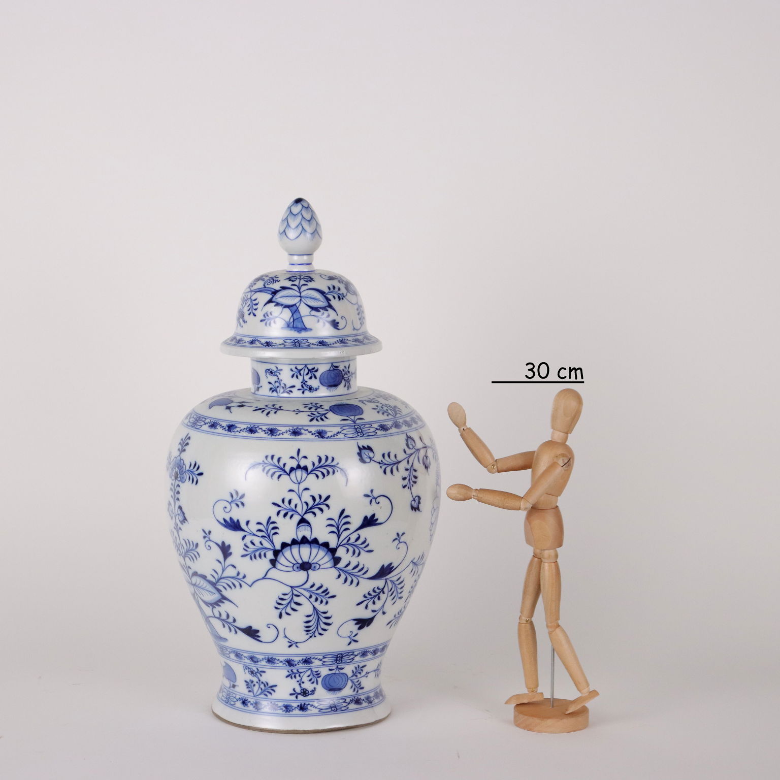 Vaso con coperchio in porcellana di Meissen con "decoro a cipolla". Lo "Zwiebelmuster" o "Blu Onion", da noi comunemente conosciuto come "Decoro Cipolla", è divenuto nei secoli un po' il simbolo della Manifattura di Meissen. E' dipinto in blu cobalto sottocoperta e raffigura fiori, alberi e frutti fortemente stilizzati. Il più antico pezzo realizzato a Meissen con questo decoro, ispirato a un disegno cinese di epoca Kangxi, è datato 1739 e venne dipinto direttamente da Hoeroldt. Vi sono stilizzati peonie, pesche giapponesi, aster e melograni che si sviluppano sinuosamente attorno a una canna di bambù. Ognuno di questi elementi ha un preciso significato nella simbologia orientale. Rappresentano: la longevità (il bambù), la buona sorte (la peonia), la gaiezza (l'aster), l'immortalità (la pesca) e la fertilità (il melograno).