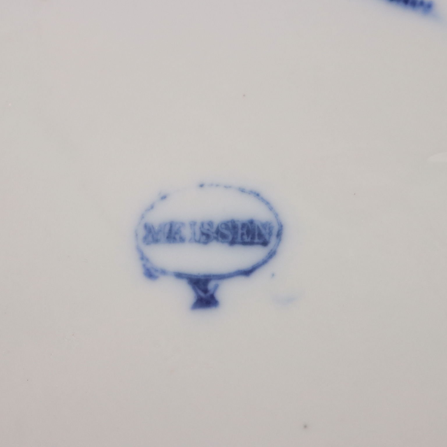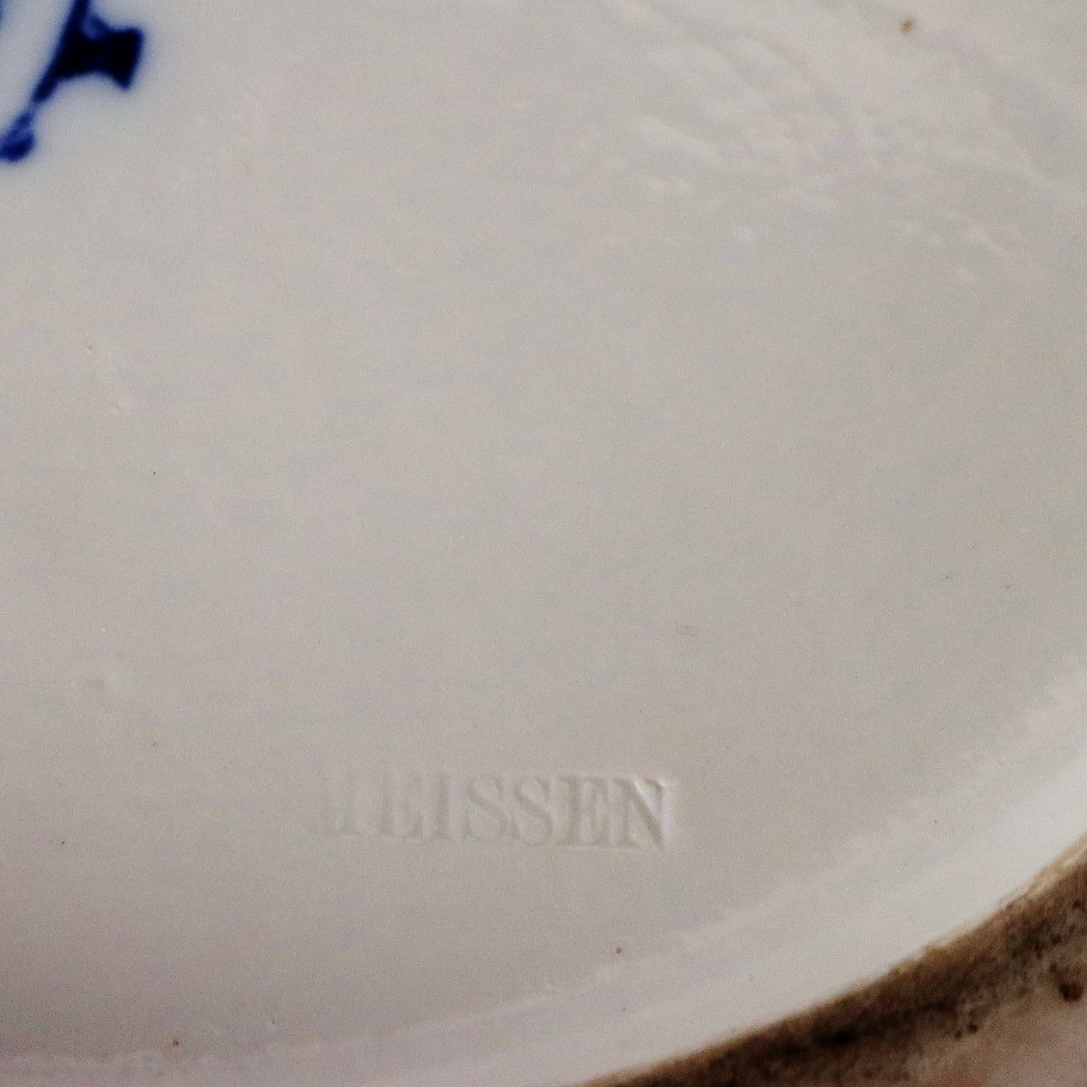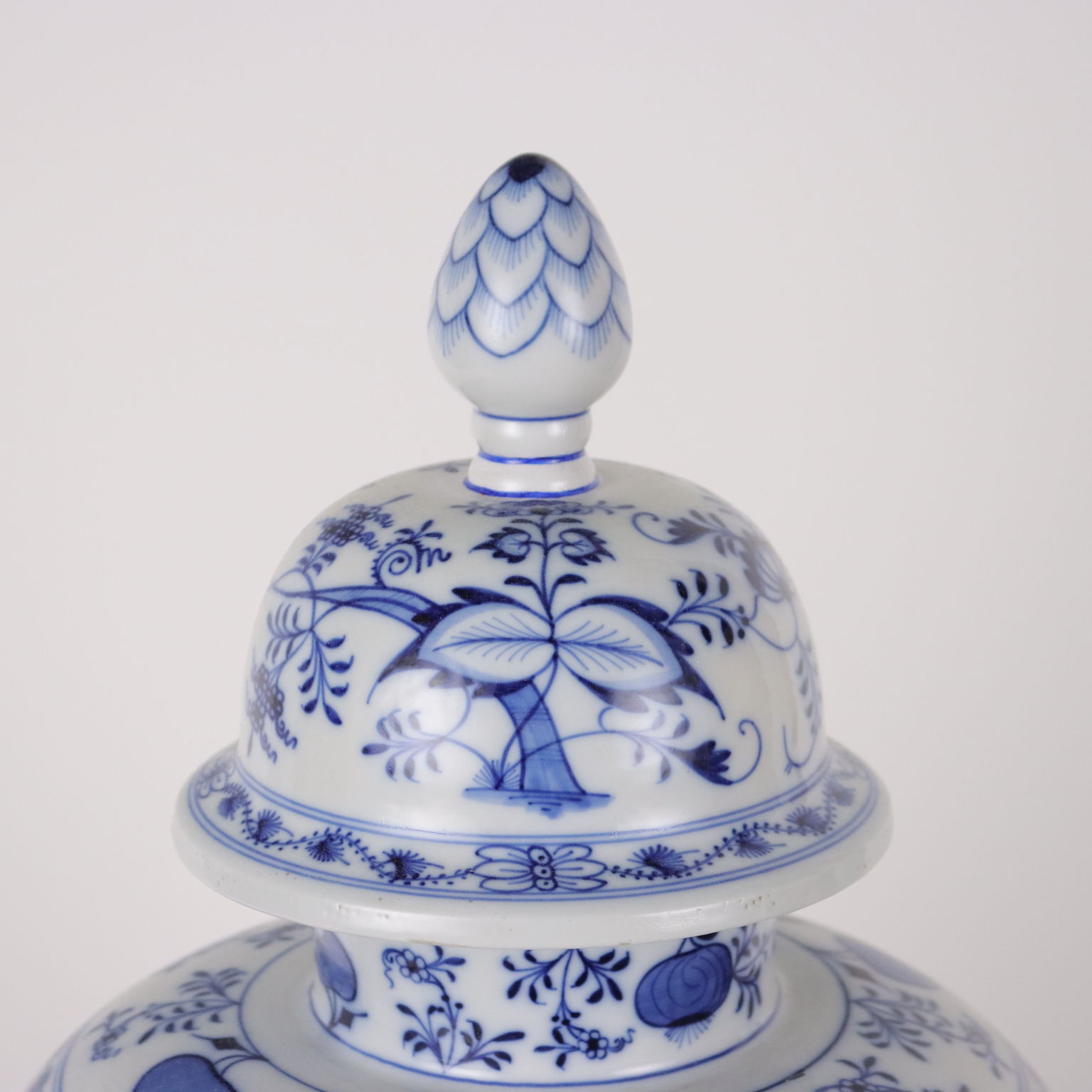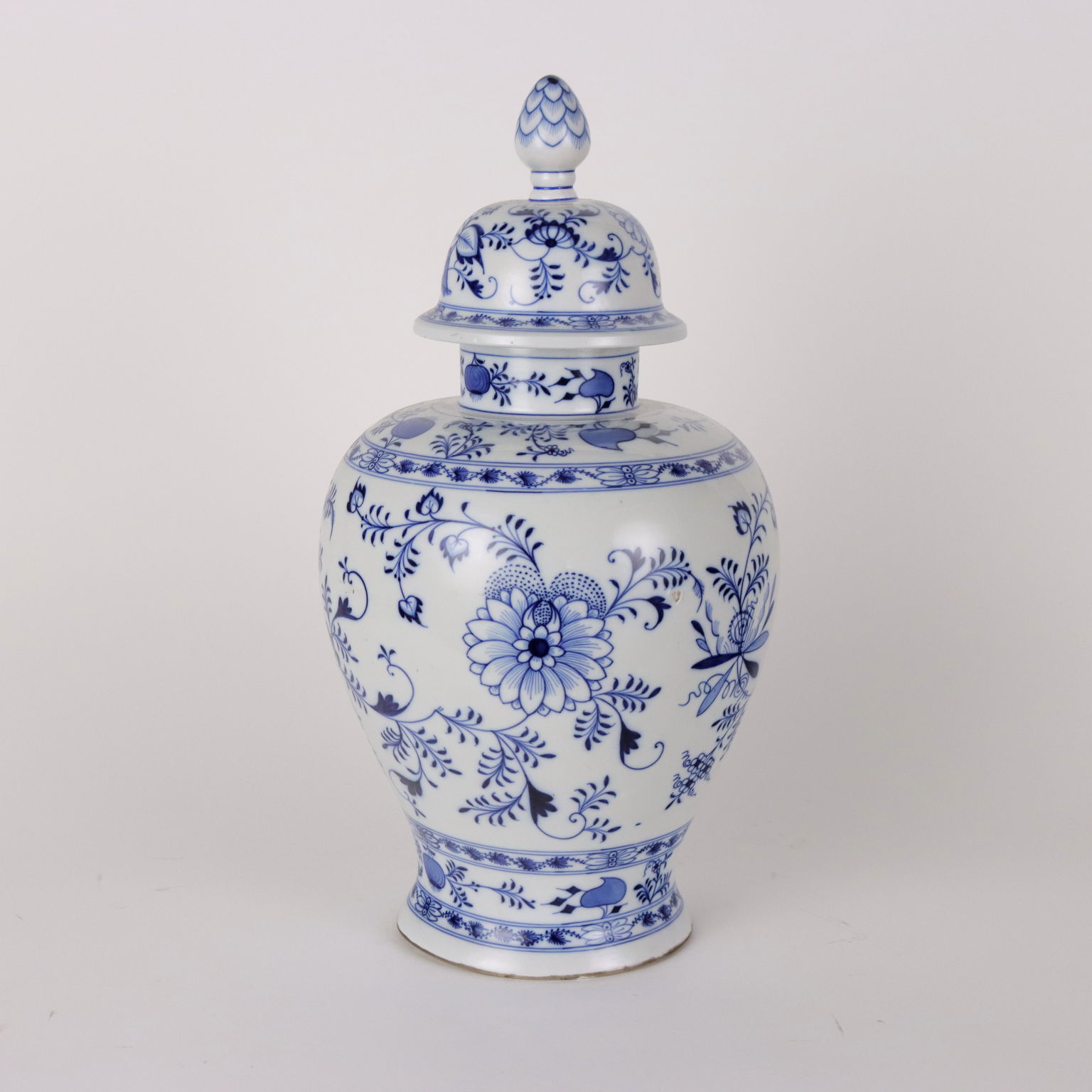 Vaso con coperchio in porcellana di Meissen con "decoro a cipolla". Lo "Zwiebelmuster" o "Blu Onion", da noi comunemente conosciuto come "Decoro Cipolla", è divenuto nei secoli un po' il simbolo della Manifattura di Meissen. E' dipinto in blu cobalto sottocoperta e raffigura fiori, alberi e frutti fortemente stilizzati. Il più antico pezzo realizzato a Meissen con questo decoro, ispirato a un disegno cinese di epoca Kangxi, è datato 1739 e venne dipinto direttamente da Hoeroldt. Vi sono stilizzati peonie, pesche giapponesi, aster e melograni che si sviluppano sinuosamente attorno a una canna di bambù. Ognuno di questi elementi ha un preciso significato nella simbologia orientale. Rappresentano: la longevità (il bambù), la buona sorte (la peonia), la gaiezza (l'aster), l'immortalità (la pesca) e la fertilità (il melograno).