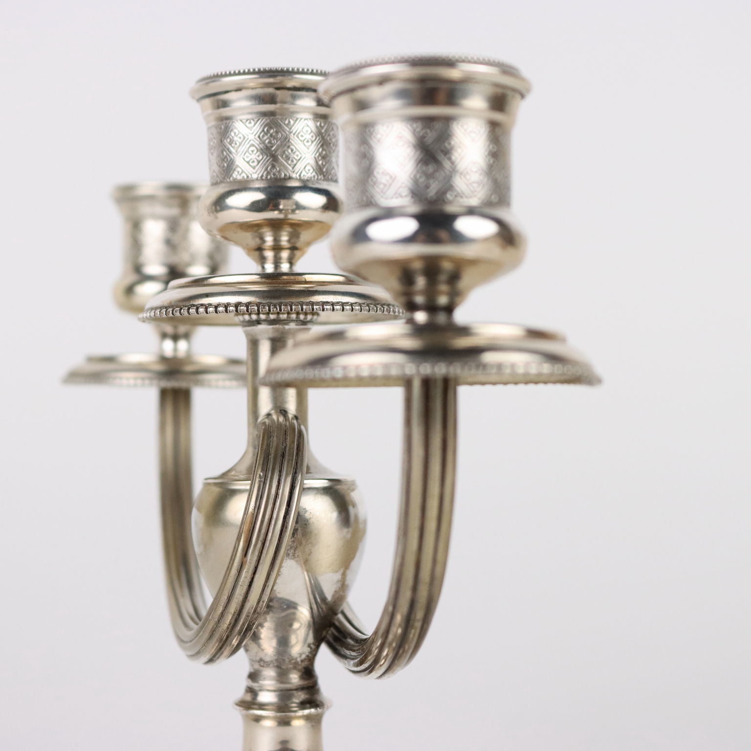 Coppia di candelabri in argento a tre fiamme. Marchio dell'argento e dell'argentiere incusso alla base. Grammi 680.