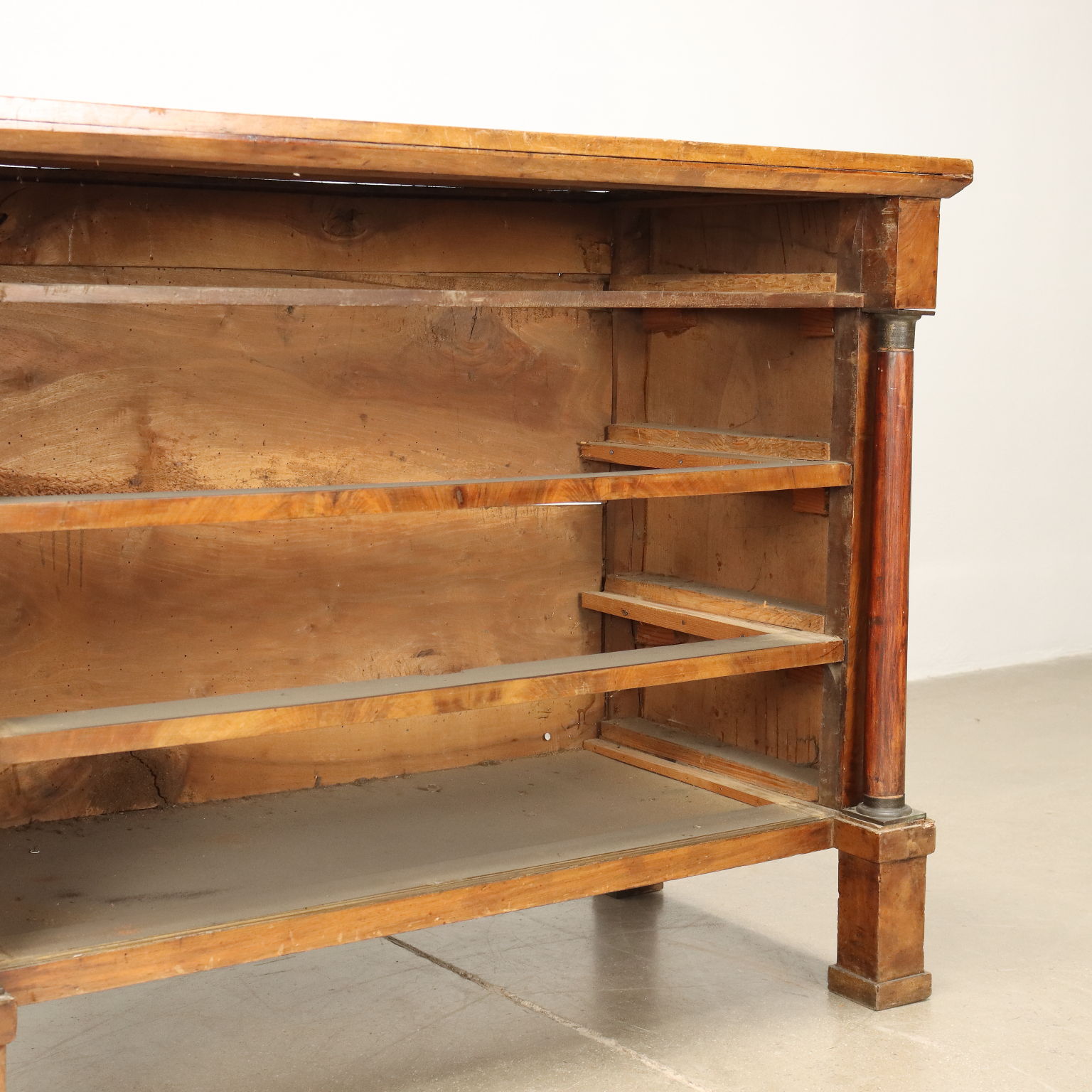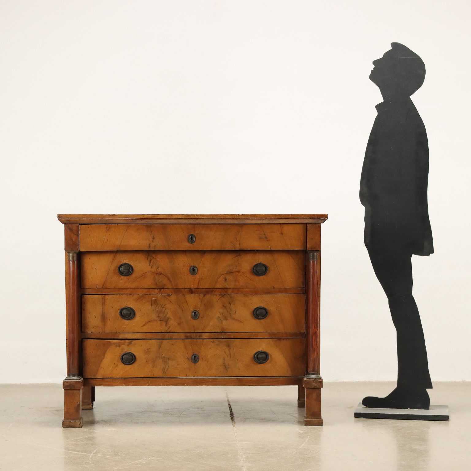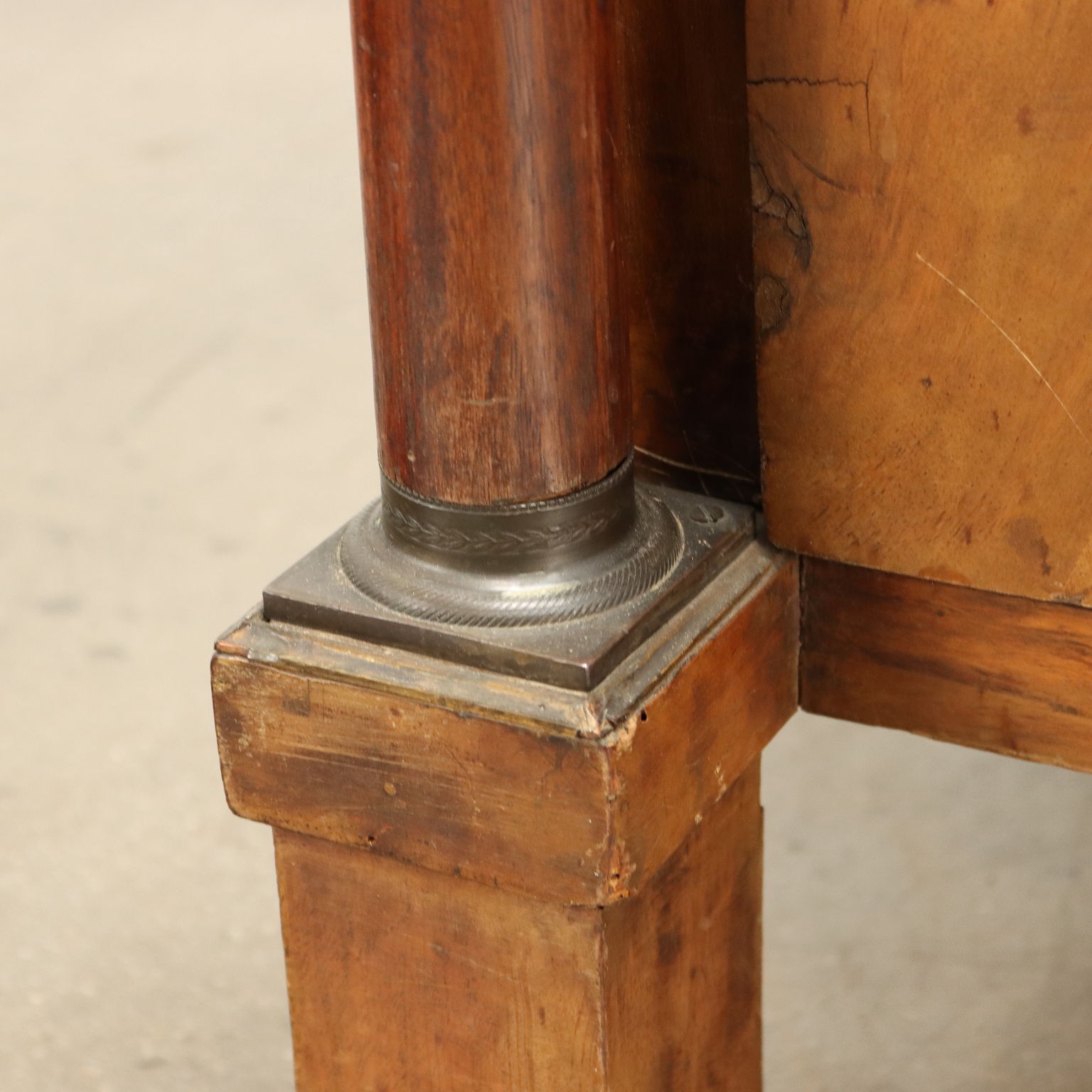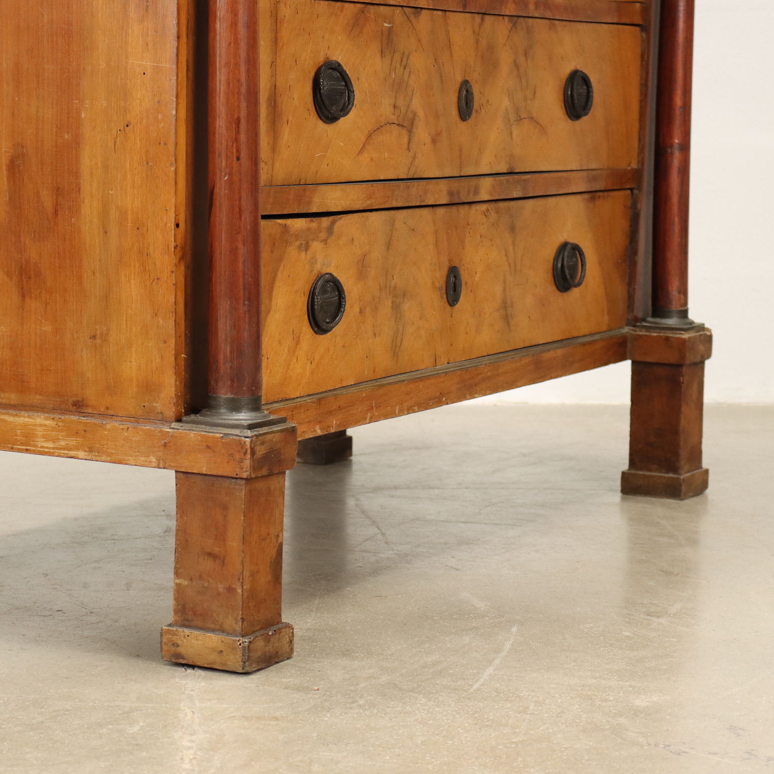 Cassettone impero lombardo in noce, Italia primo quarto XIX secolo. Fronte lastronato in pedule di noce a 3 cassetti più 1 nella fascia, montanti a colonna ornati da capitelli in bronzo brunito, piedi a plinto.