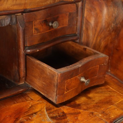 Descrizione Trumeau in stile barocchetto impiallacciato in noce e radica di noce, Italia inizio XX secolo. Alzata a 2 ante dotate di specchi acidati ritraenti coppia di figure idealizzate del periodo, internamente carta geografica del Ducato di Milano, ripiano in vetro, 4 cassetti e vano centrale. Corpo a ribalta con scarabattolo a 4 cassetti, fronte a 3 cassetti, gambe mosse. Filettata sia esternamente che all'interno dello scarabattolo. Interni in abete.