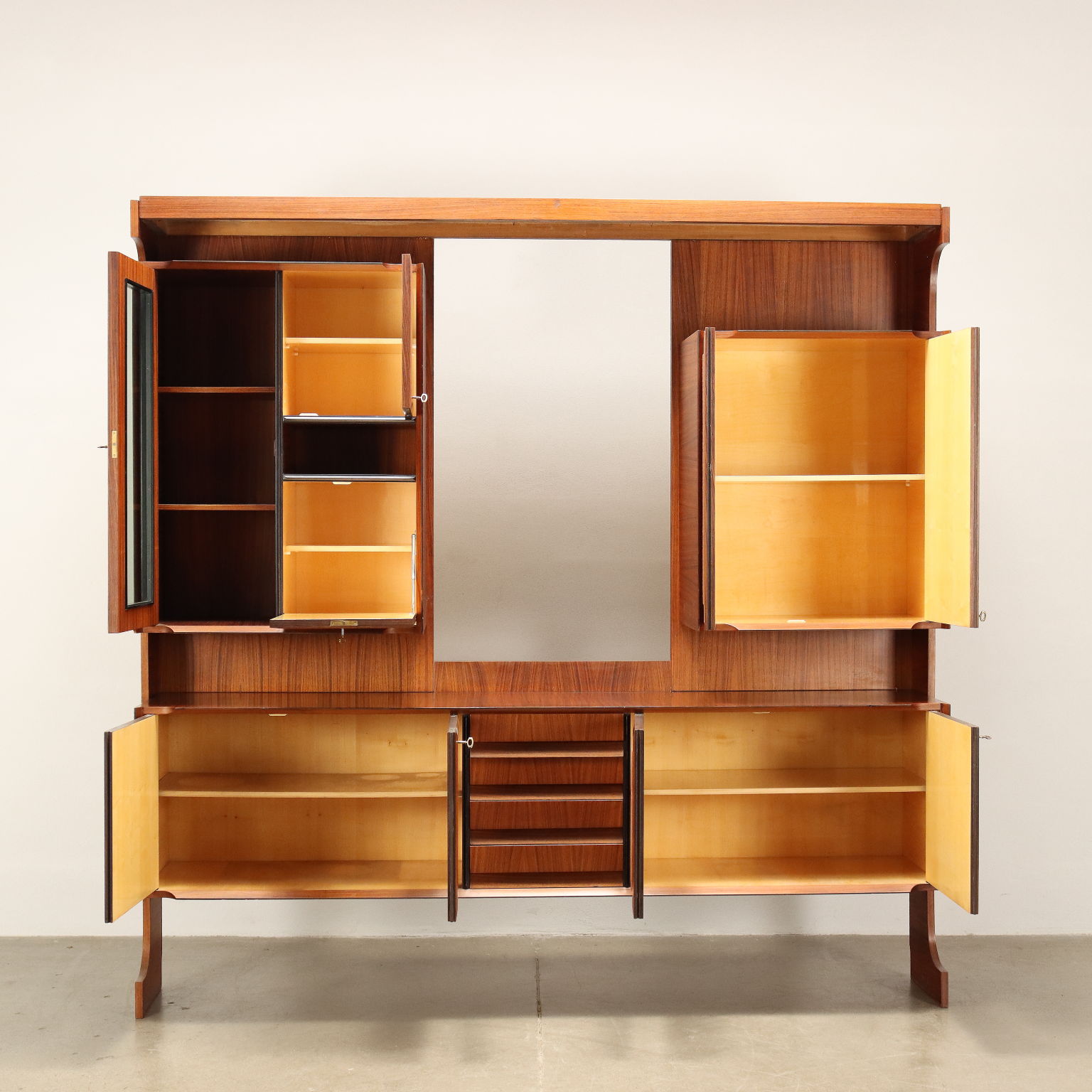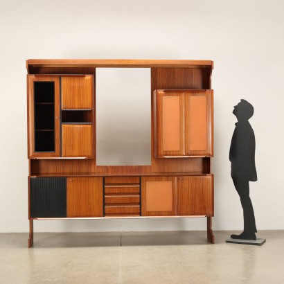 Mobile con contenitori ad ante battenti e ribalta. Legno impiallacciato legno esotico, vetro, pannelli rivestiti in tessuto e "grissinato".