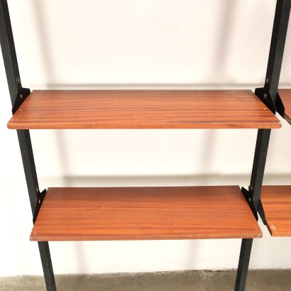 Libreria a soffitto, montanti in metallo con puntali in ottone, ripiani a posizione regolabile, in legno impiallacciato Mogano.