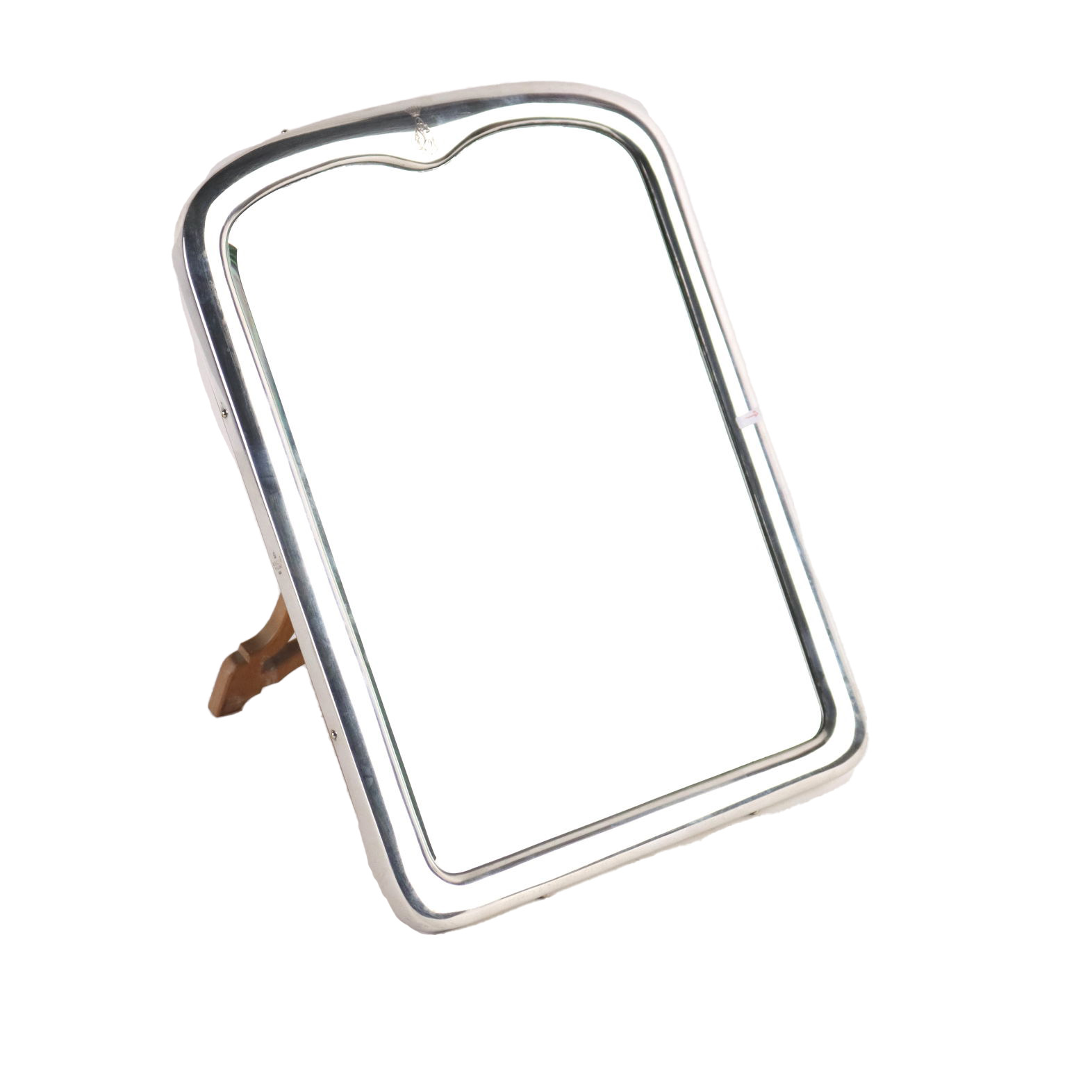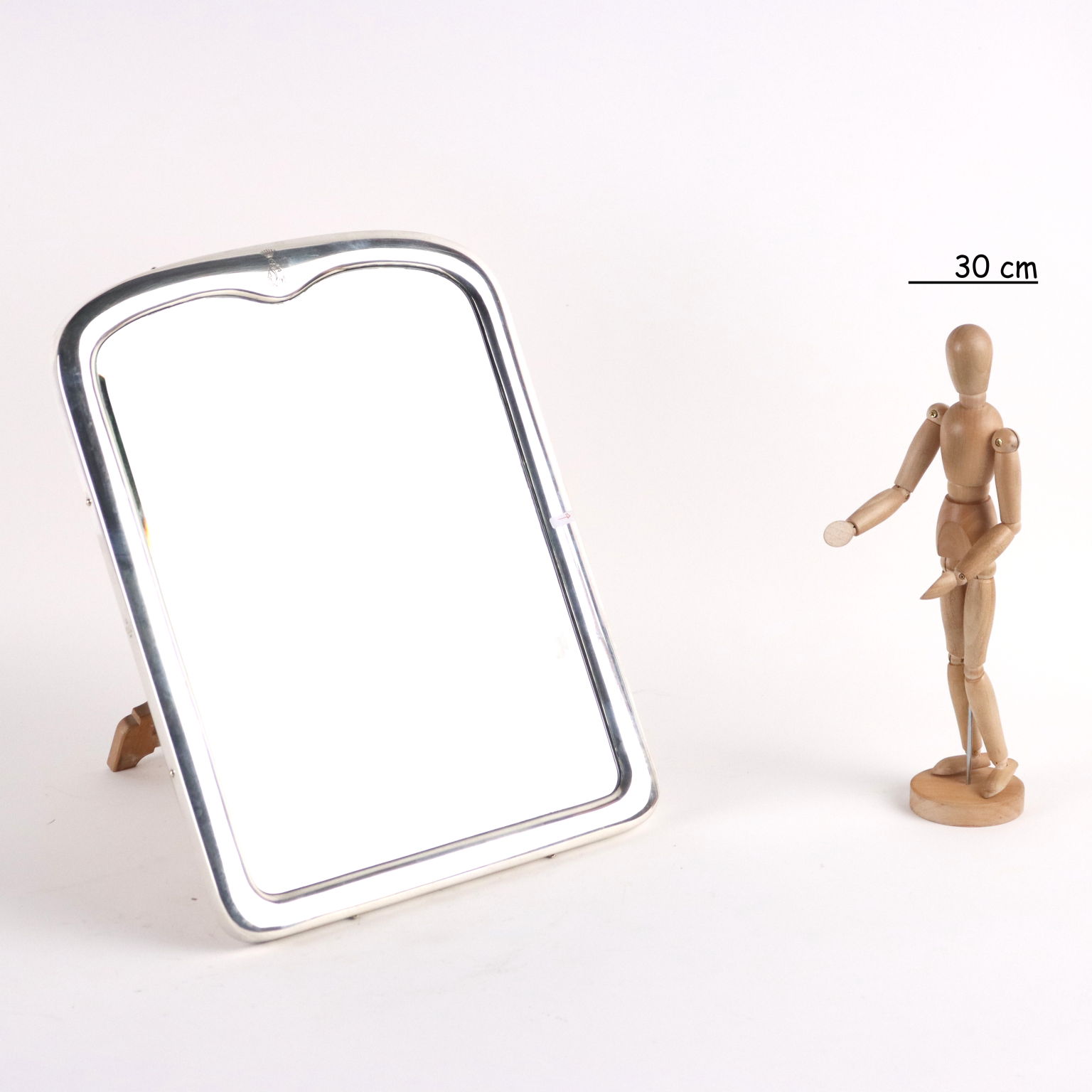 Specchiera da tavolo in argento con specchio bisellato. A lato marchio dell'argento e della manifattura incussi.