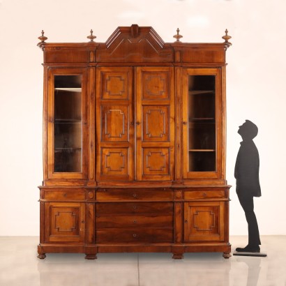 Libreria umbertina in noce, Italia fine XIX secolo. Cappelliera con 4 puntali "a vaso" torniti, alzata a 4 ante, 2 laterali in vetro soffiato e 2 centrali pannellate. Corpo con tiretto e 3 cassetti nella fascia, coppia di ante pannellate, 3 cassetti nella sezione centrale, piedi a mensola e torniti. Decorata con cornici tipiche del periodo.