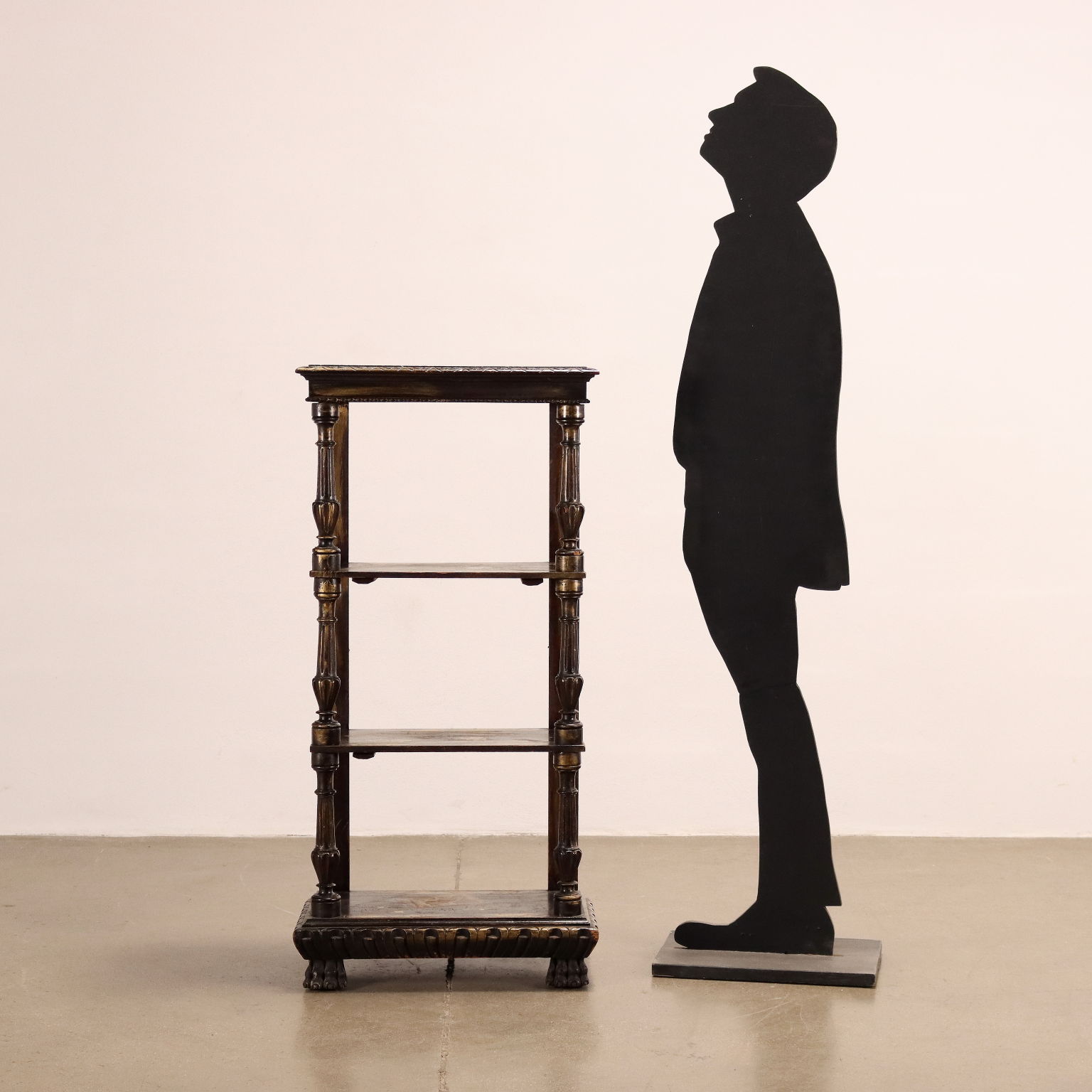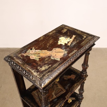 Étagère in stile in abete intagliato, ebanizzato e parzialmente dorato, Italia XX secolo. Decorato sui vari ripiani utilizzando la tecnica del decoupage, con soggetti a tema musicale e floreali. Piedi ferini.