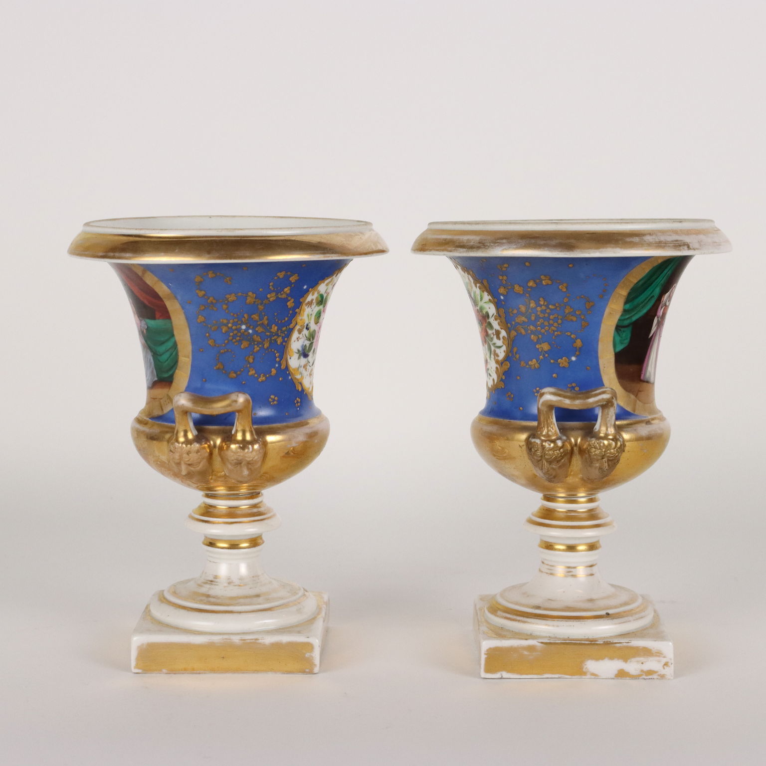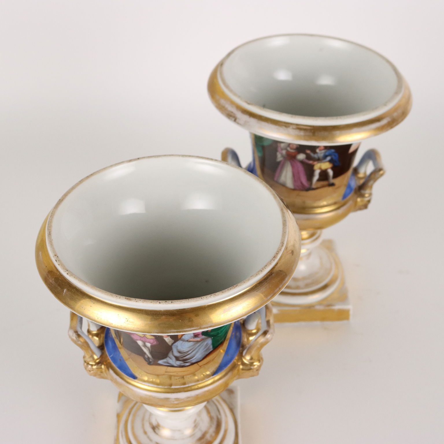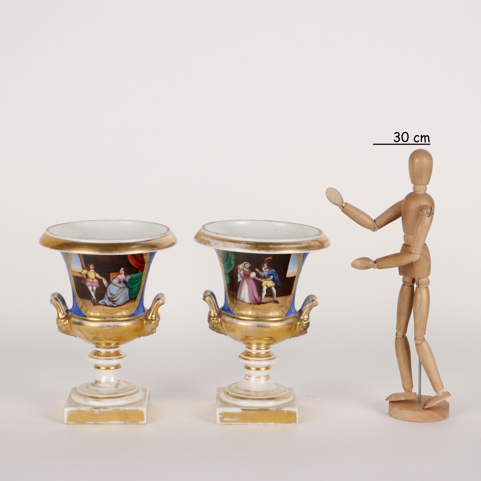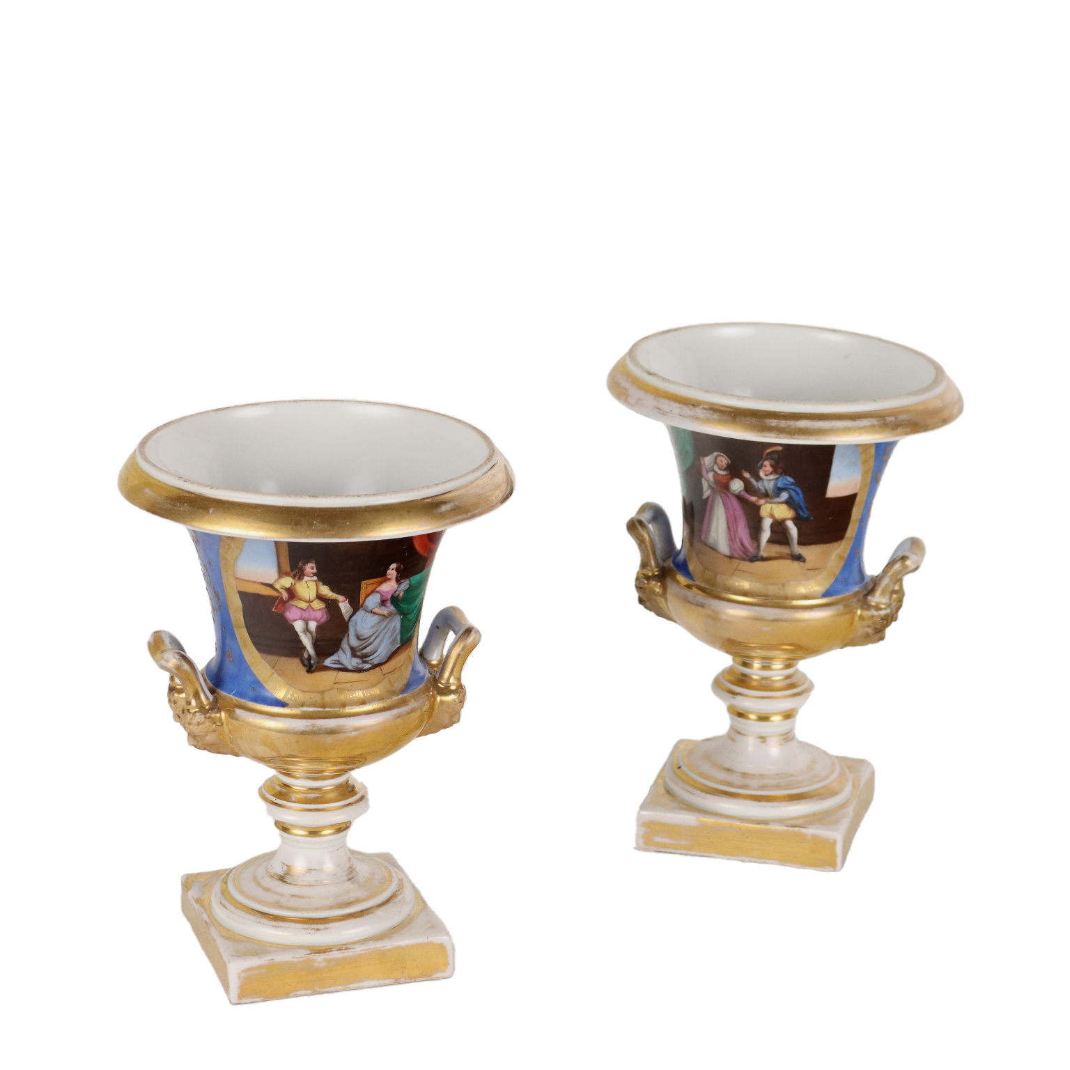 Coppia di vasi a cratere in porcellana con decori in oro e piccole anse con mascheroni. Nelle riserve scene galanti e composizioni di fiori dipinte a policromia.