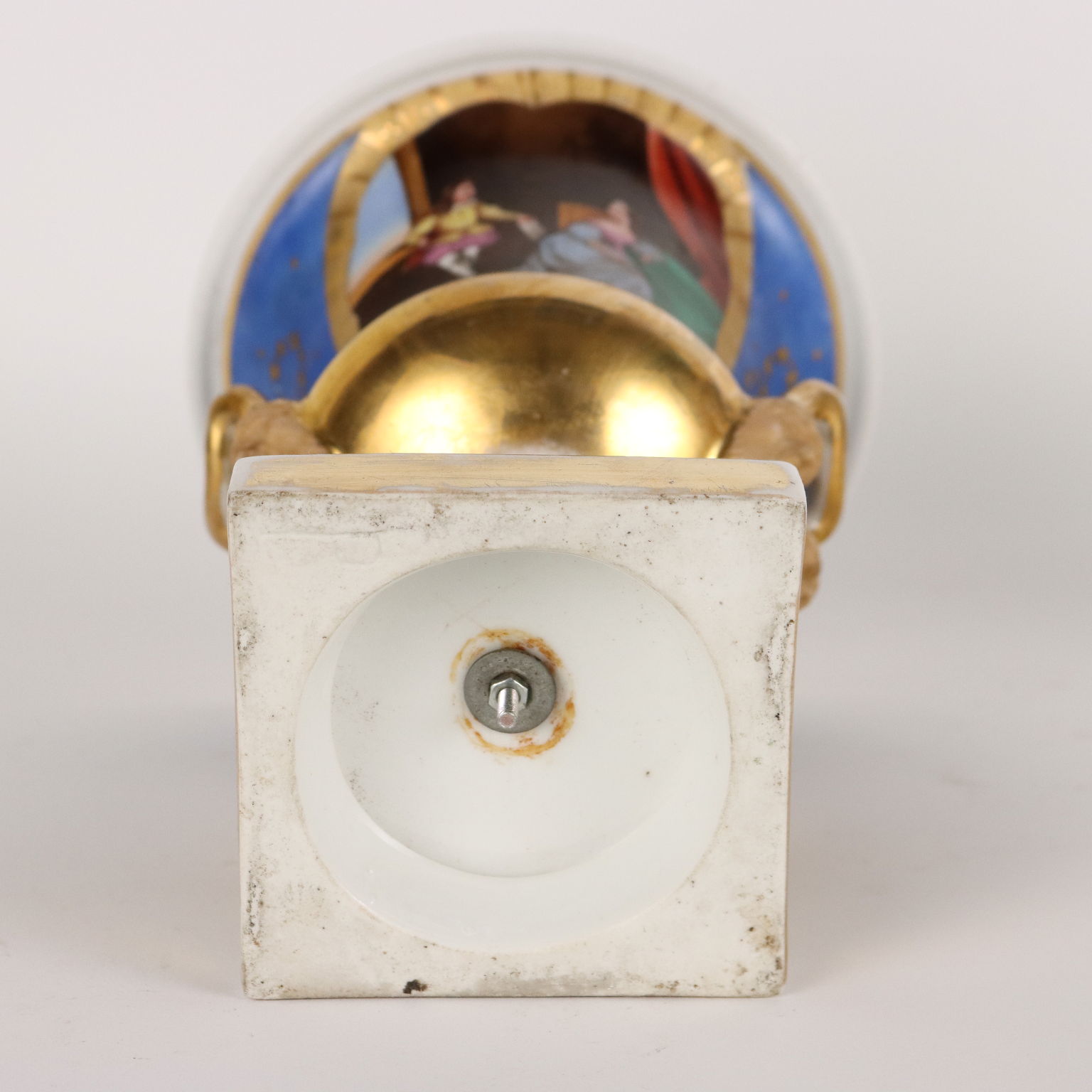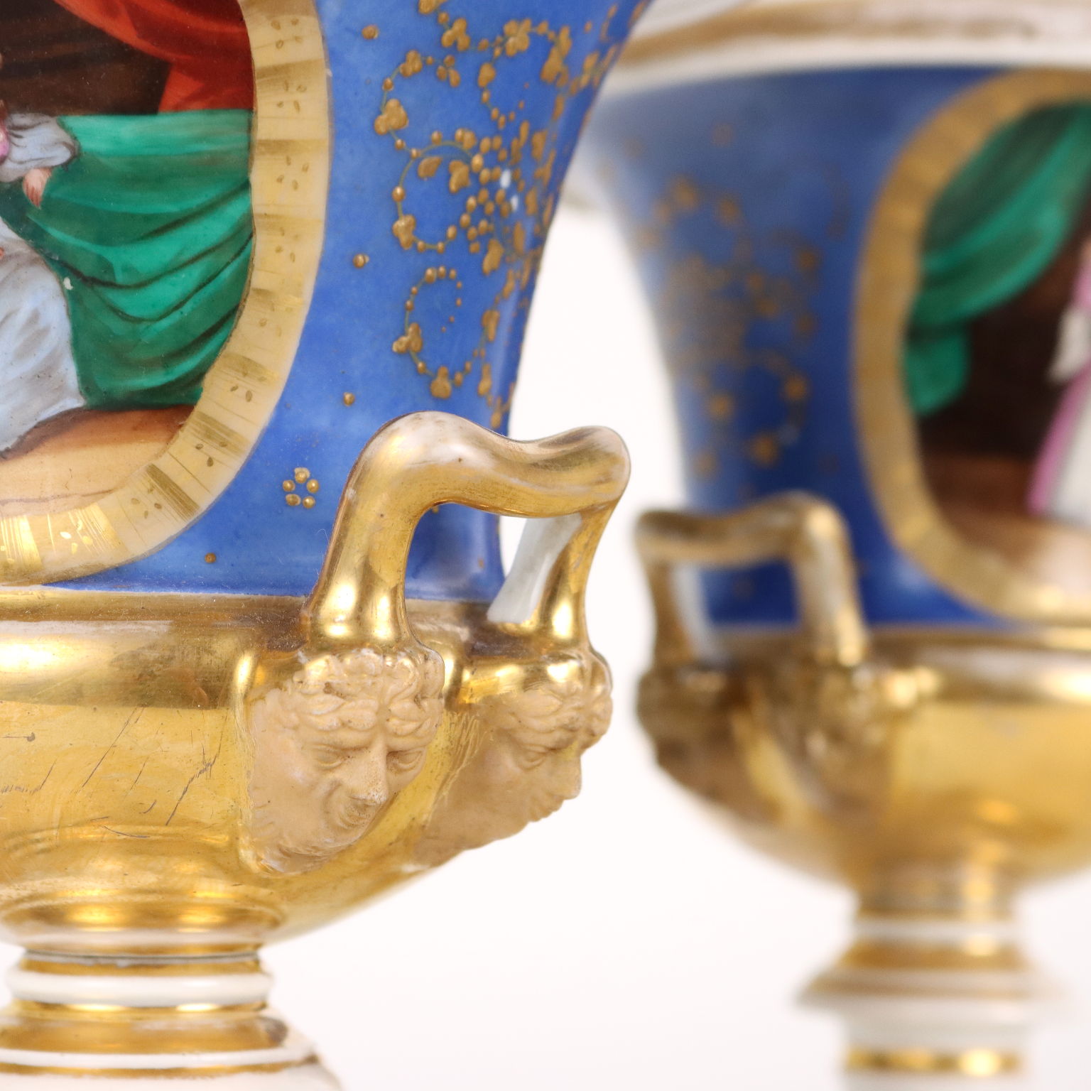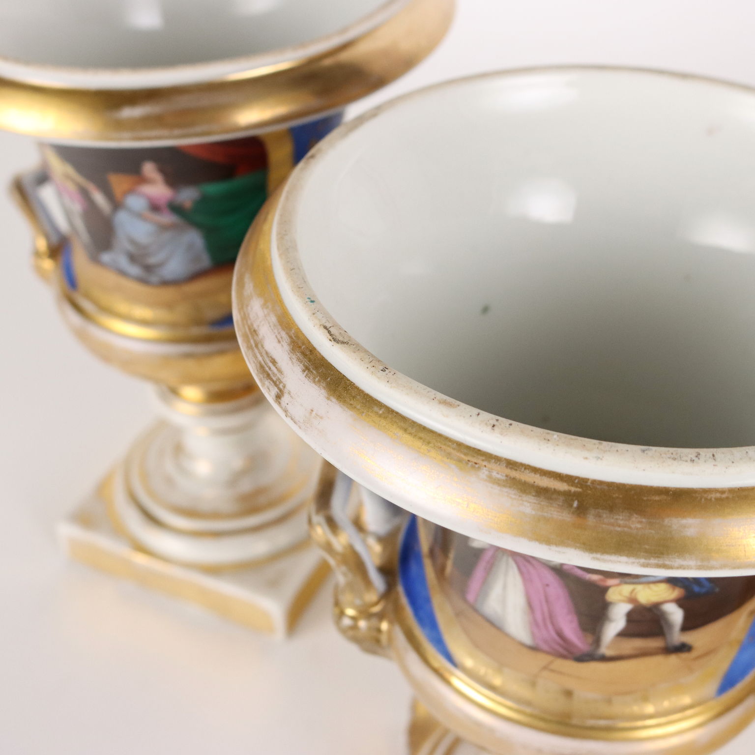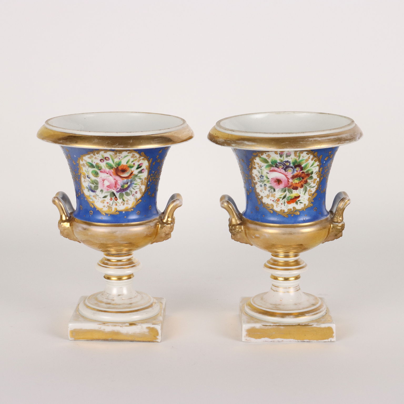 Coppia di vasi a cratere in porcellana con decori in oro e piccole anse con mascheroni. Nelle riserve scene galanti e composizioni di fiori dipinte a policromia.