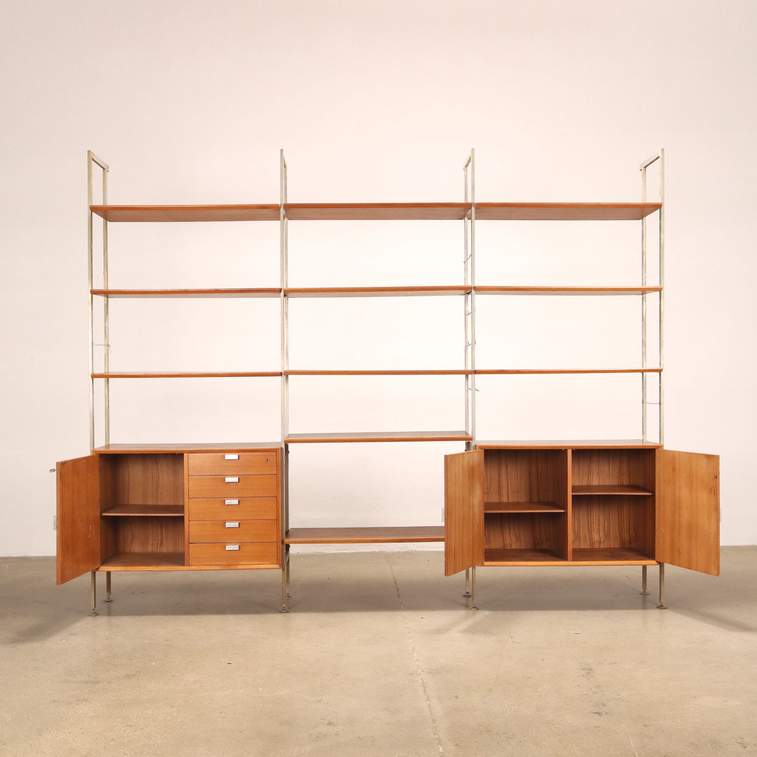 Libreria con elementi contenitore ad ante battenti e cassetti, ripiani a posizione regolabile.