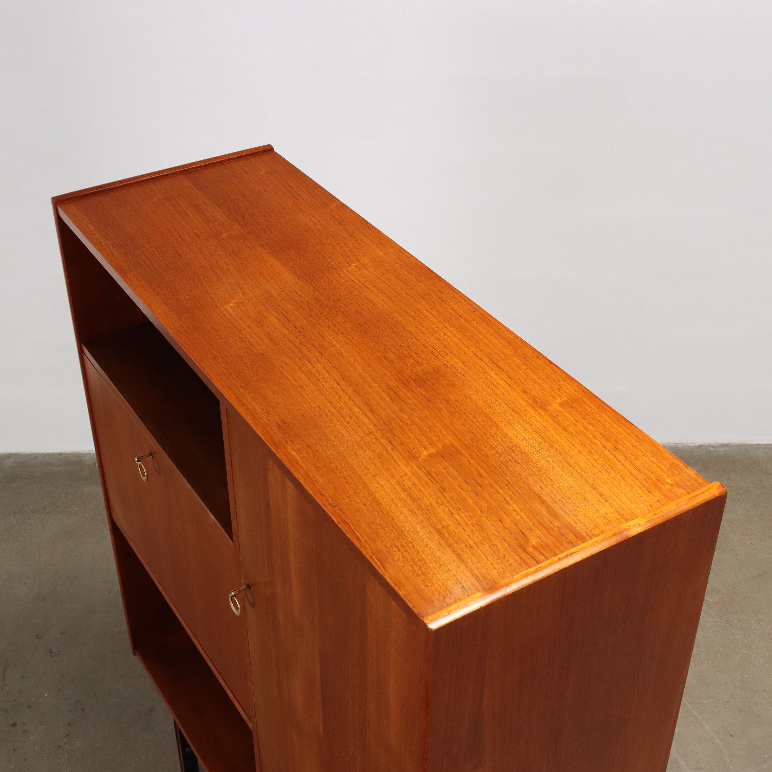 Mobile anni '60 con vani a giorno, vani contenitori di cui uno con anta a ribalta e uno con anta battente e due cassetti. In legno di teak con maniglie in ottone.