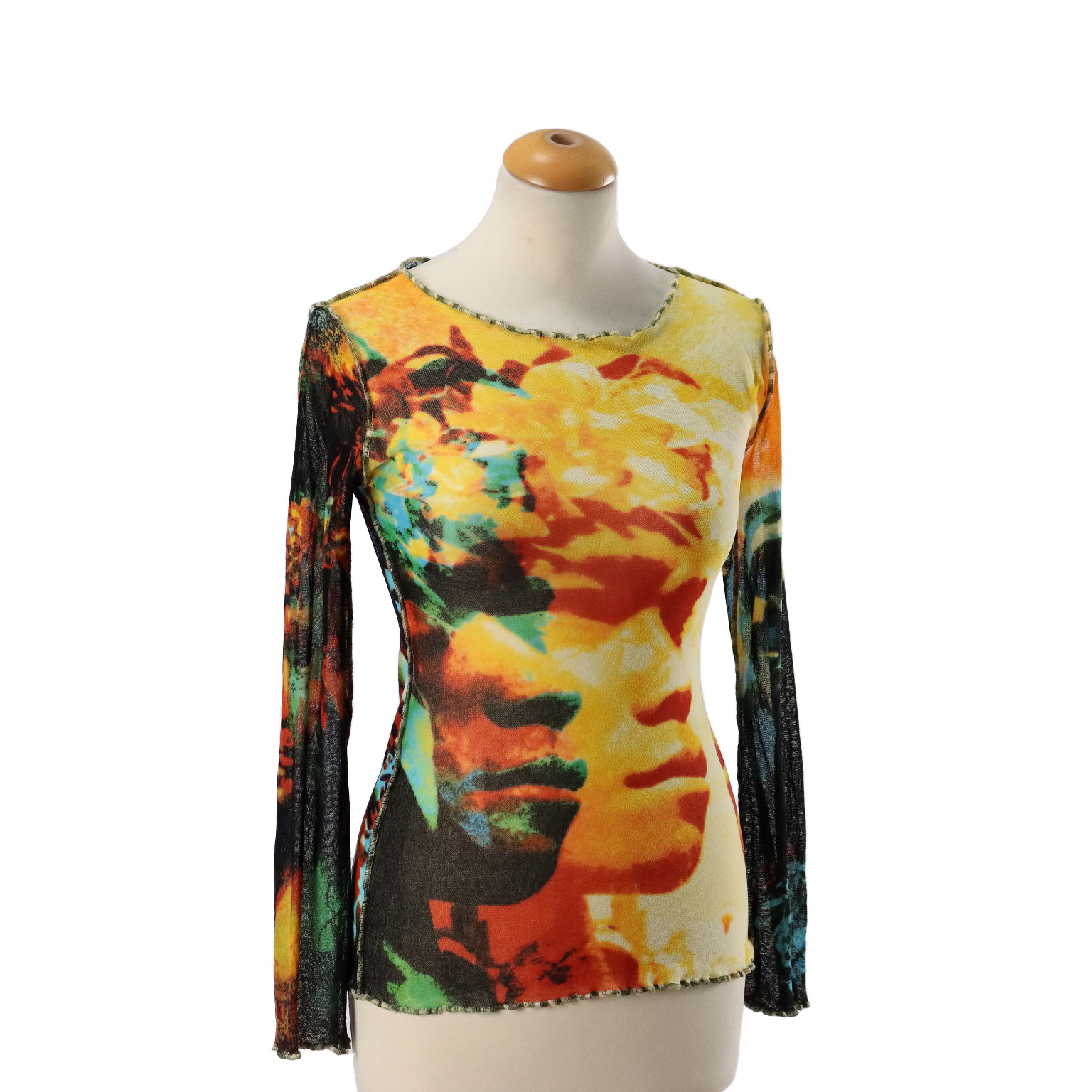 Maglia a maniche lunghe in tulle, della celebre linea "Maille", dello stilista parigino Jean Paul Gaultier. Caratterizzata da un'originale stampa dallo stile esotico e da dettagli come le cuciture e gli orli a vista.