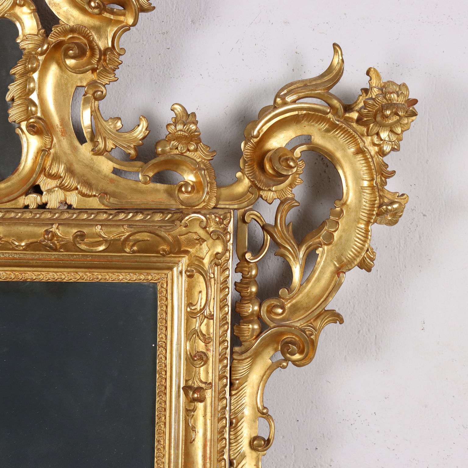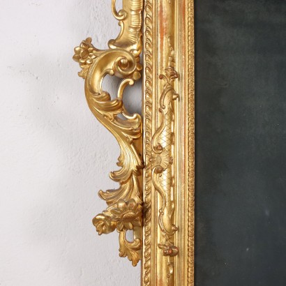 Descrizione Grande specchiera veneta intagliata e dorate della fine del XIX sec. Su una cornice intagliata a piccole volute si innestano sulla cimasa e sui lati delle volute intagliate con riccioli ed elementi floreali; sulla cimasa creano una riserva con specchio. Completamente dorata a foglia con parti opache e parti lucidate.