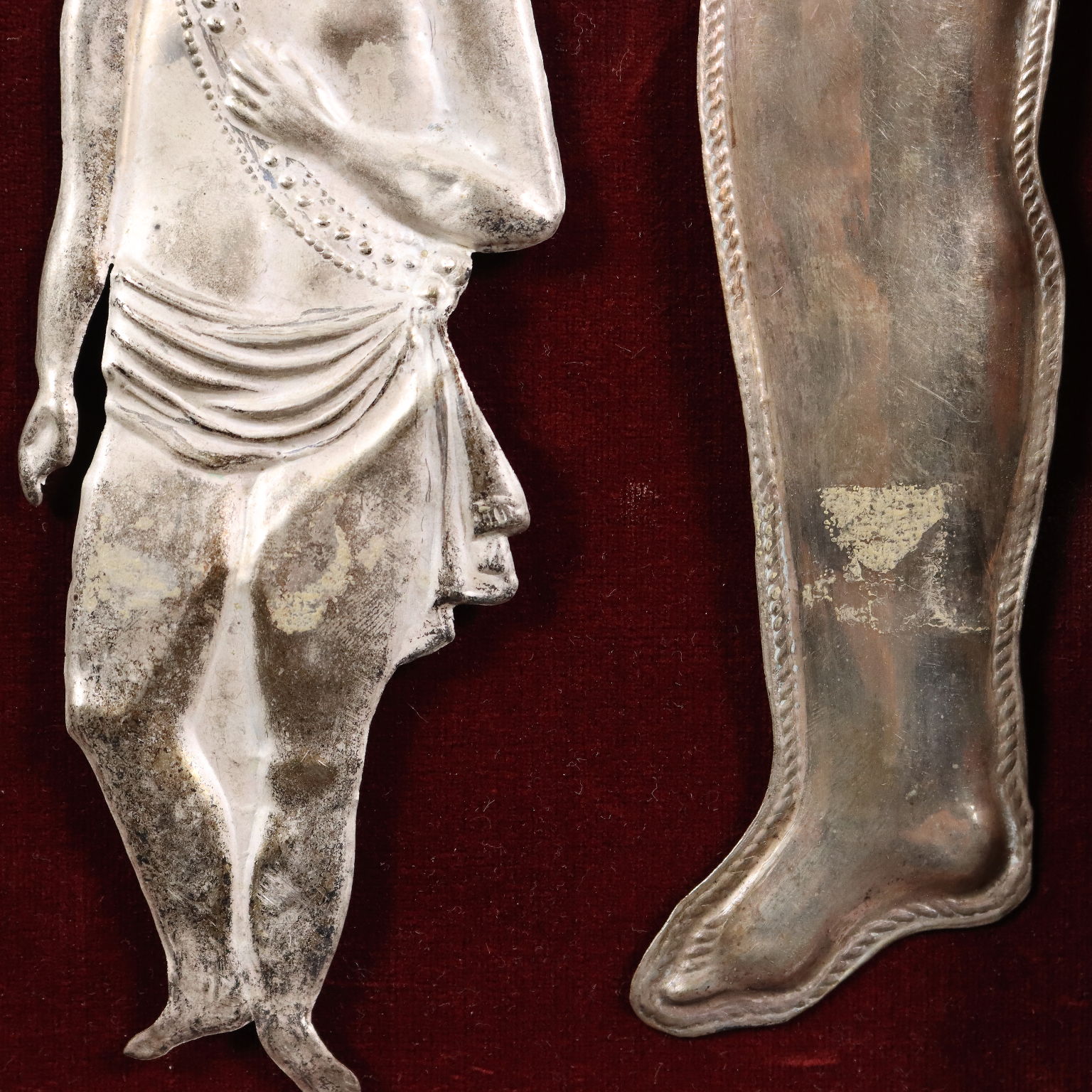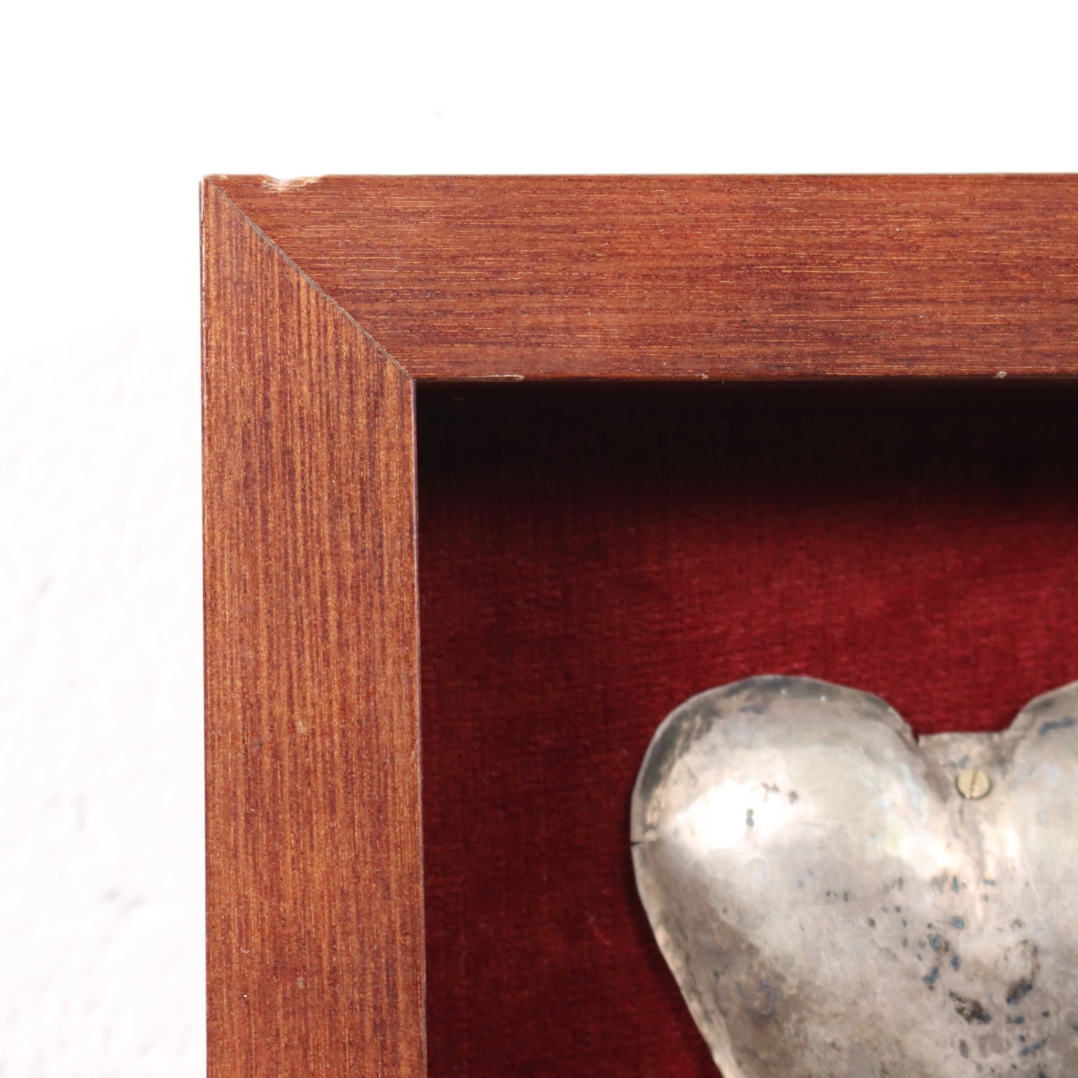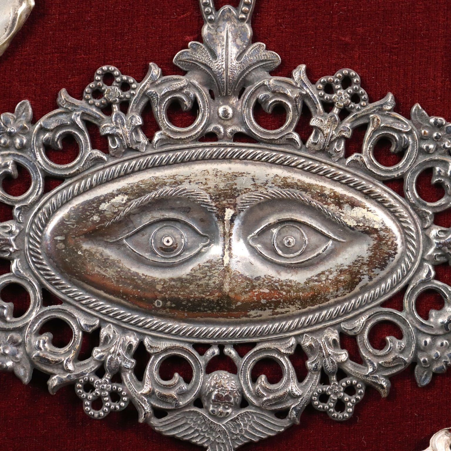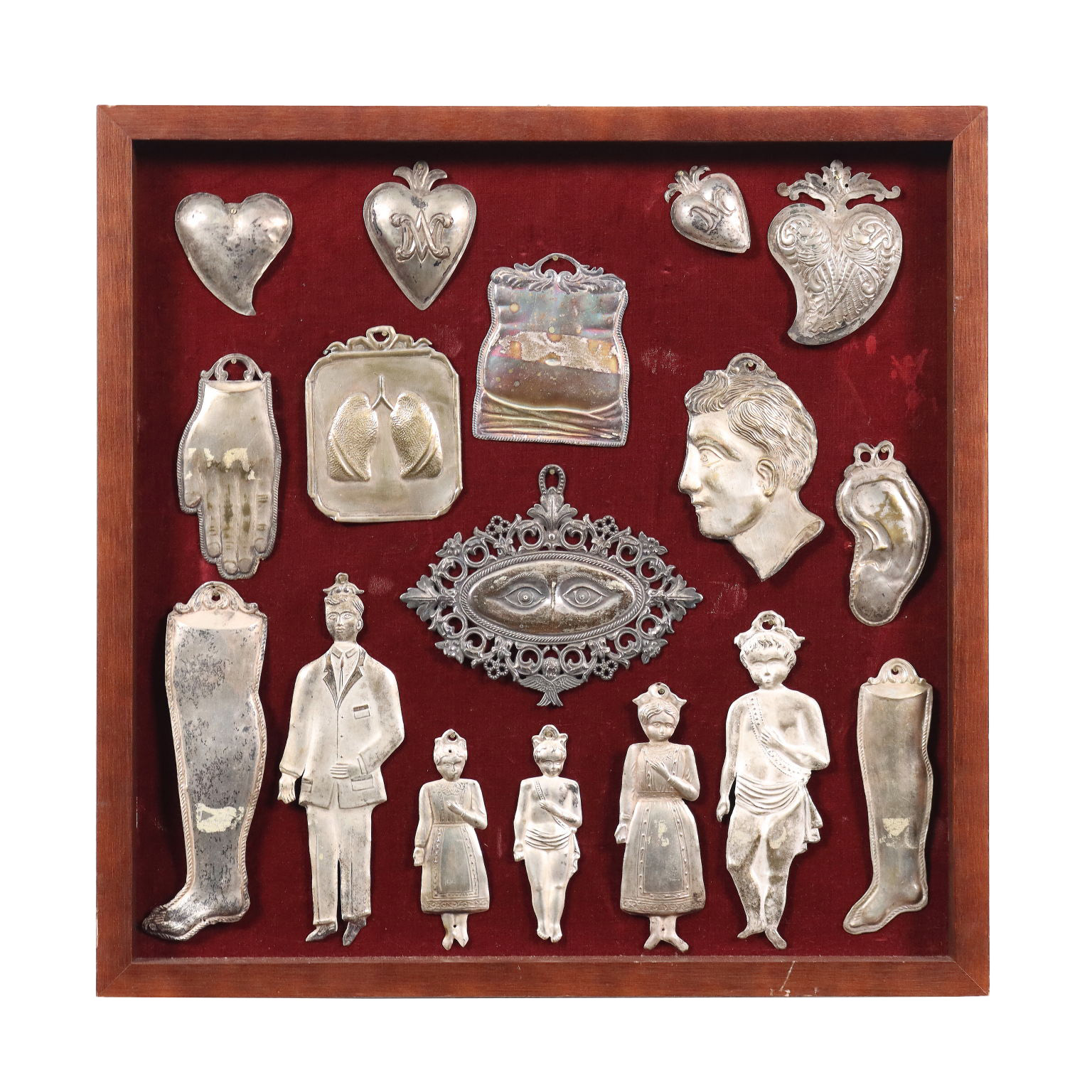 Si tratta di 17 ex voto in metallo sbalzato, montati su un pannello ligneo rivestito in velluto rosso e incorniciato. Cinque di questi ex voto raffigurano figure umane per intero, maschili e femminili e in fogge d'abito diverse; sette rappresentano parti anatomiche differenti: gli occhi, due gambe, un orecchio, i polmoni, una mano, una testa; quattro sono i tipici cuori con le iniziali al centro della persona graziata; infine un ex voto non identificato. Gli ex voto sono quegli oggetti offerti (tuttora!) nei santuari per ringraziare il destinatario del dono (Dio, la Madonna, un santo) di aver esaudito una preghiera, quindi testimonianti la Grazia ricevuta. Spesso le preghiere di grazia sono connesse alla sfera della salute e quindi all'ambito corporeo, per cui, fra le varie tipologie di oggetti votivi, ricorrenti sono gli ex voto anatomici, che rappresentano nella grande maggioranza l'organo malato, gli oggetti-segno della malattia da cui la persona è stata guarita. Oppure, come nelle raffigurazioni di figure umane intere, l'ex voto rappresenta la persona stessa che è stata graziata.