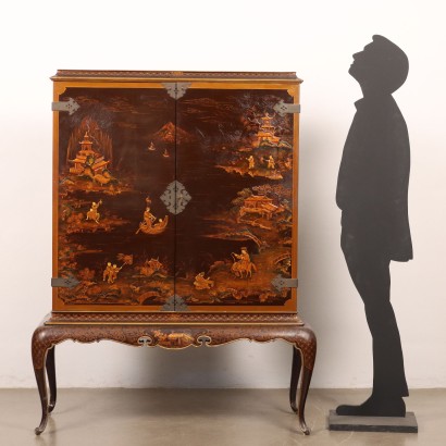 Mobile bar sorretto da gambe mosse a ricciolo, il corpo è interamente laccato e dipinto con paesaggi e personaggi alla chinoiserie; le due ante sul fronte danno accesso al mobile bar interno, con fondo a specchio e laccatura rossa, anche in questo caso dipinta con piante di gusto orientale.