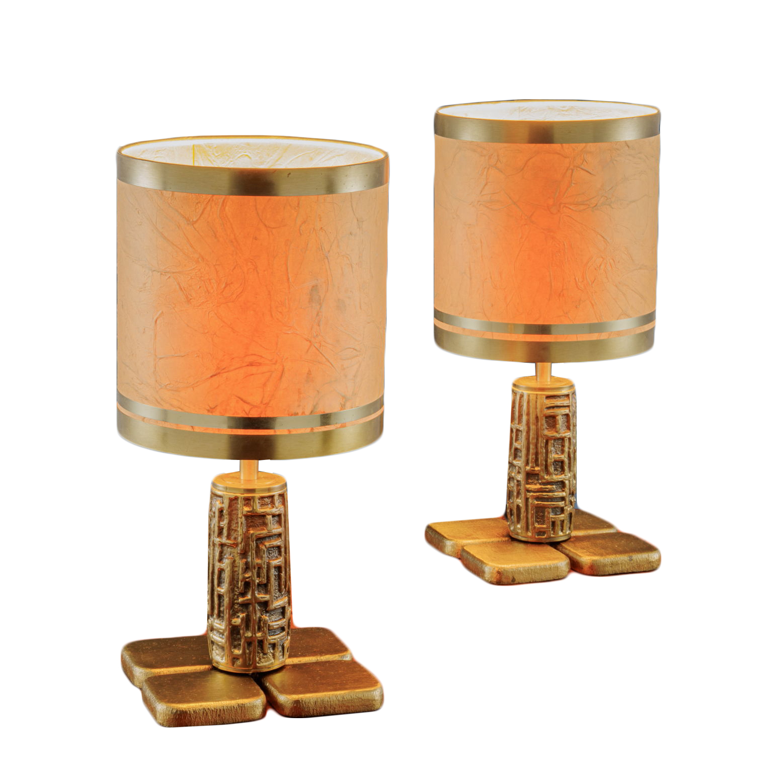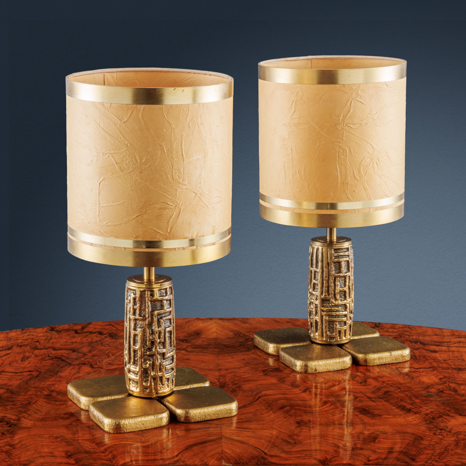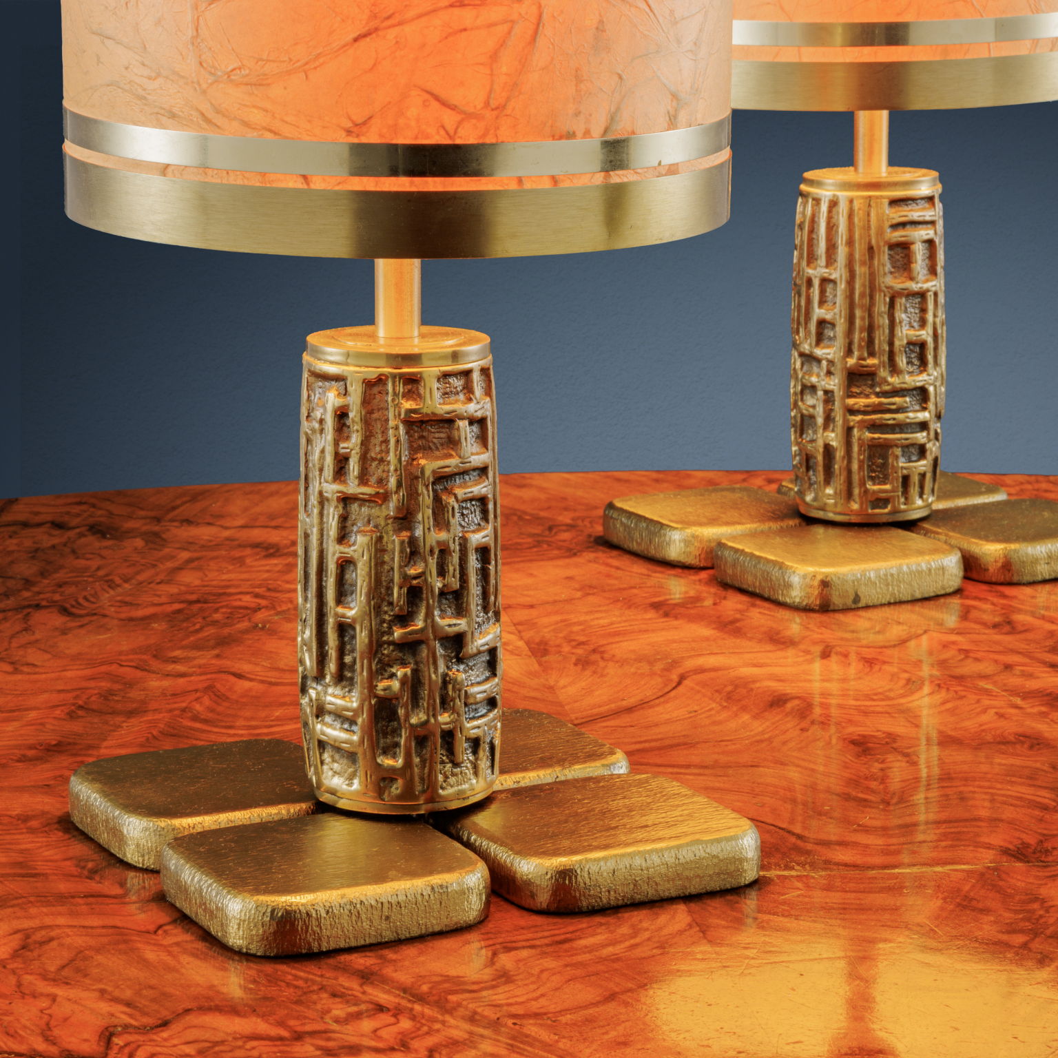 Coppia di lampade da tavolo con originale base in fusione di ottone lavorato secondo lo stile tipico di Luciano Frigerio, paralume in carta.