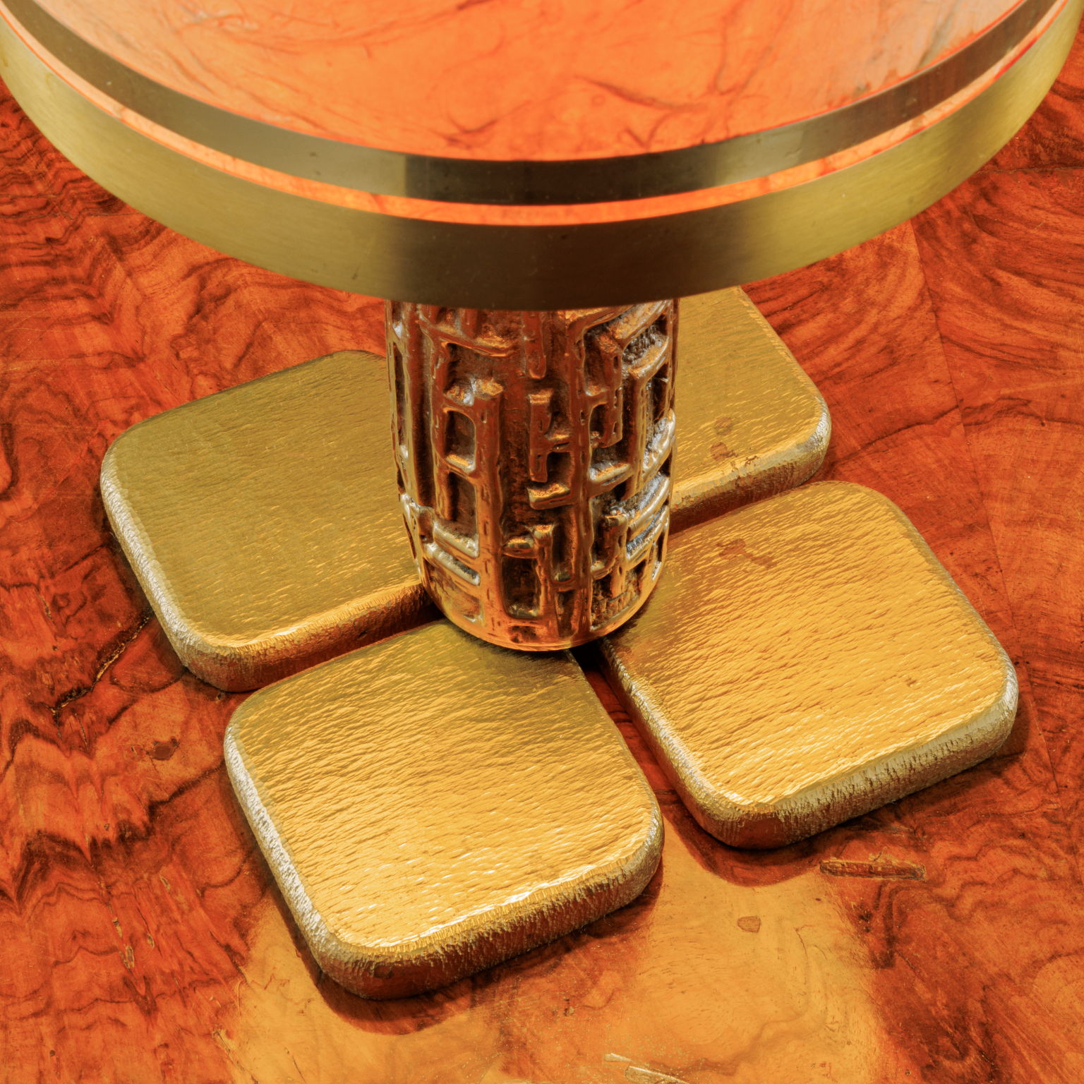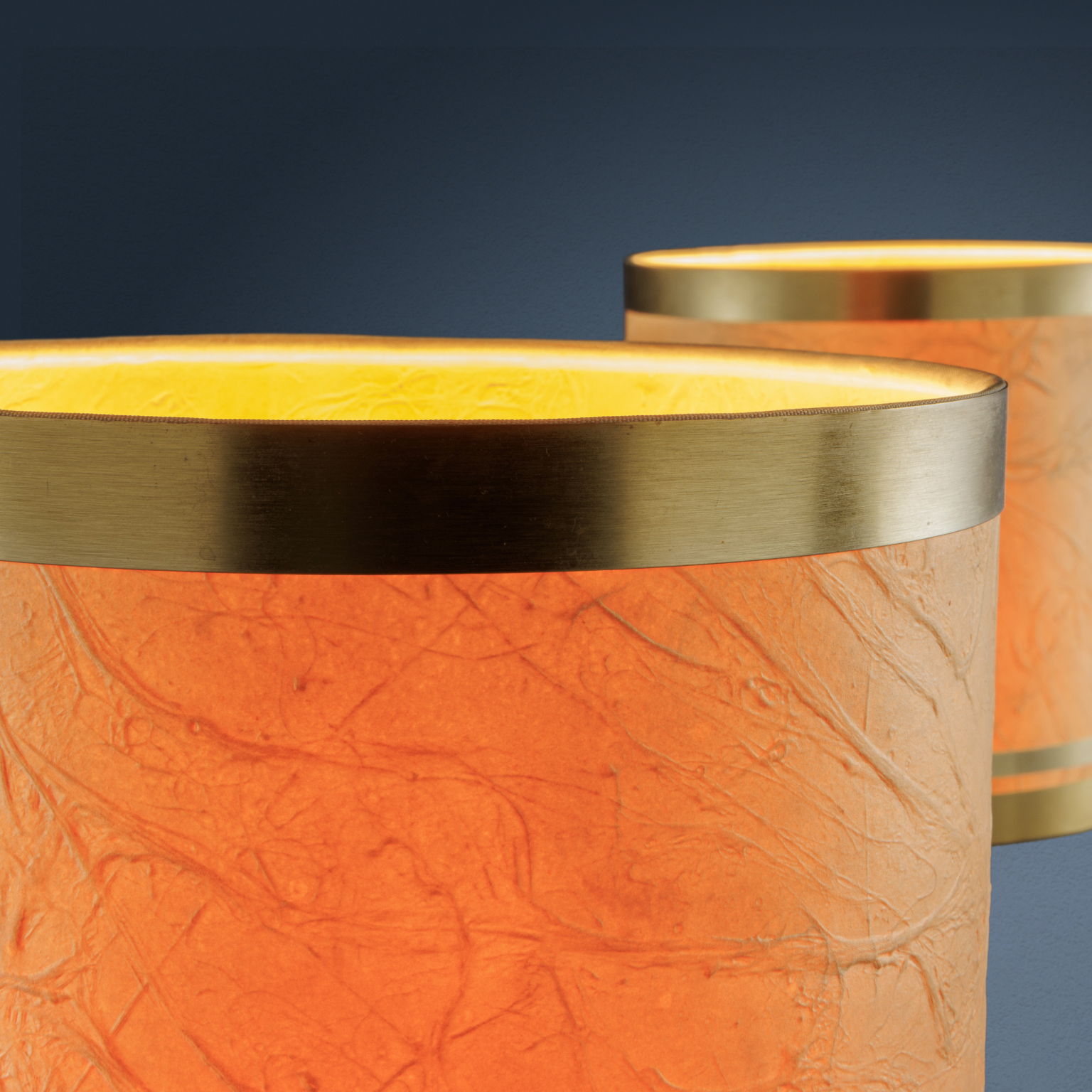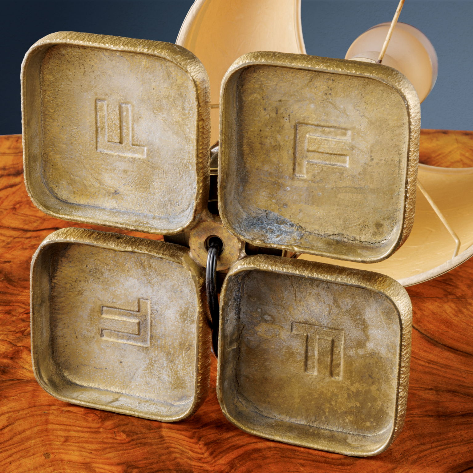 Coppia di lampade da tavolo con originale base in fusione di ottone lavorato secondo lo stile tipico di Luciano Frigerio, paralume in carta.