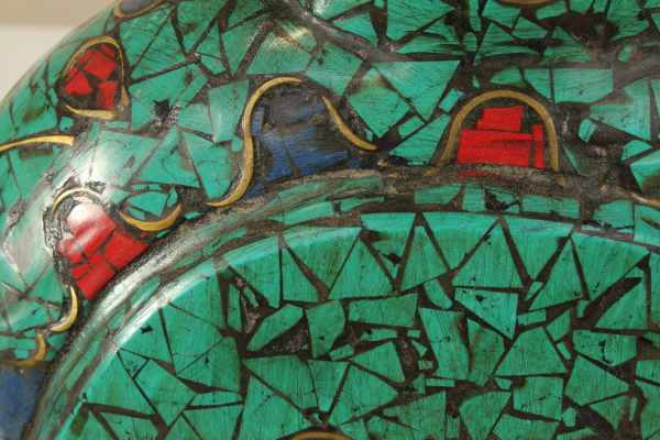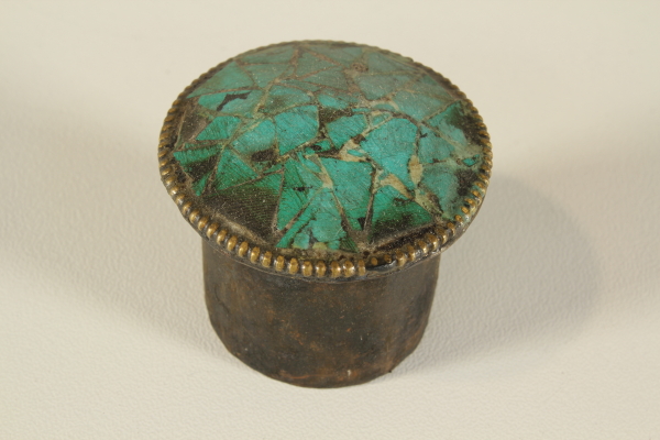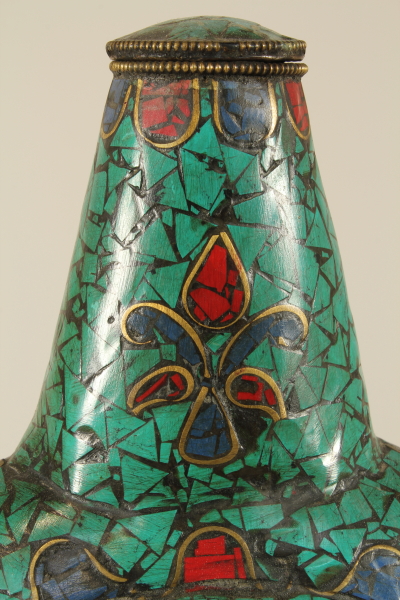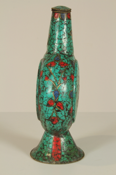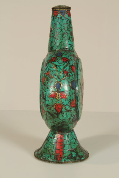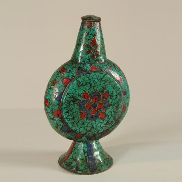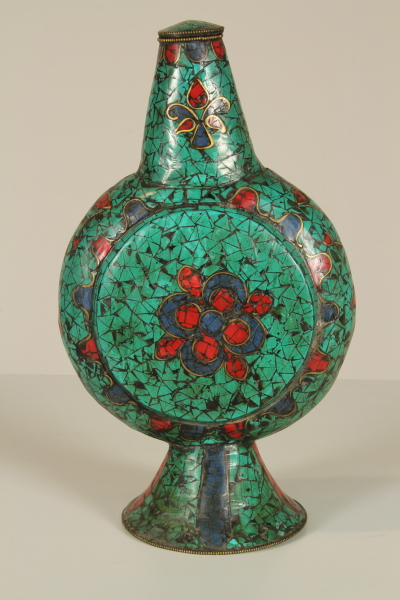 Fiasca in metallo cloisonne, arte nomade. Tappo con qualche mancanza.