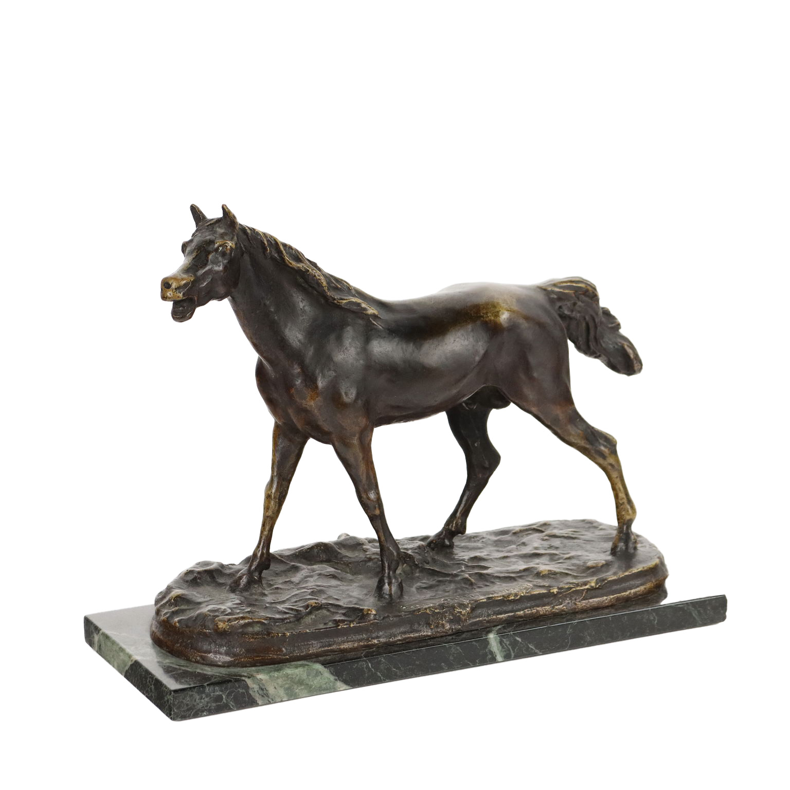 Scultura in bronzo su base in marmo raffigurante cavallo. Sulla base firma incussa dell'autore ma poco leggibile.