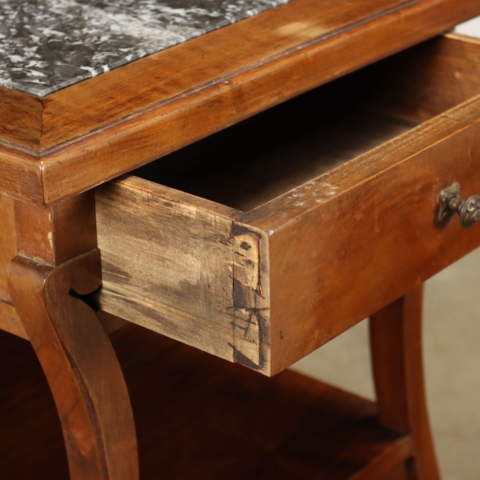 Coppia di comodini liberty in noce attribuibili a Carlo Zen, facenti parte di una camera da letto composta da armadio, comò, pettineuse, letto, coppia di comodini, poltrona e due sedie. Piano con marmo nero incassato, cassetto nella fascia, montanti mossi, anta ornata da intagli floreali e piedi ad arco. Secondo piano d'appoggio collocato a metà della struttura. Cassetto realizzato successivamente.