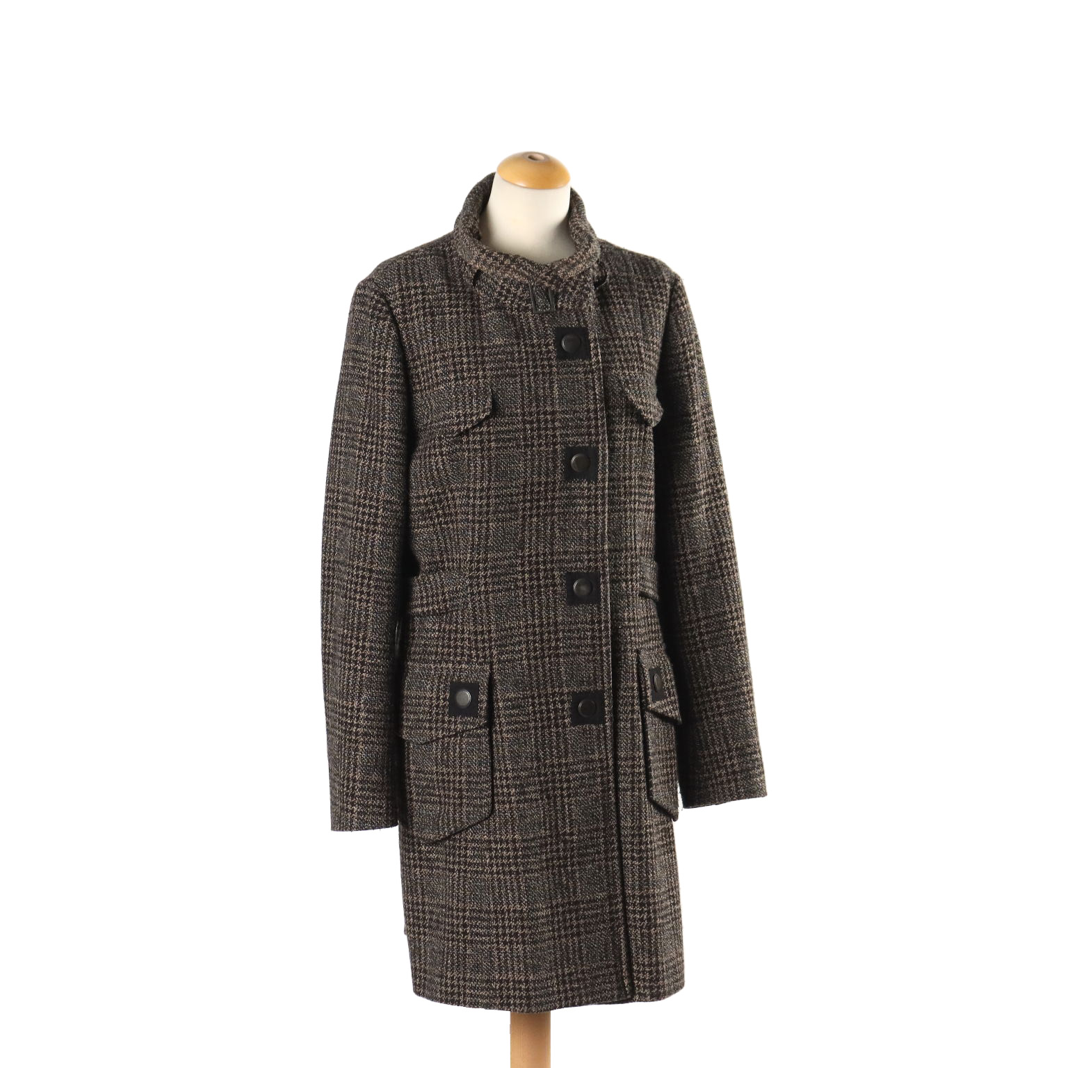 Cappotto Newpenny da donna in Principe di Galles, sui toni del marrone e nero, con filo verdone e bluette. Presenta allacciatura monopetto con bottoni automatici, incorniciati in modo originale. Cintura fissa in vita e cinturino decorativo al colletto. Due tasconi frontali e due piccole tasche finte. Taglia 48. Buone condizioni.