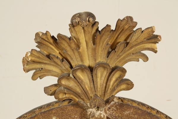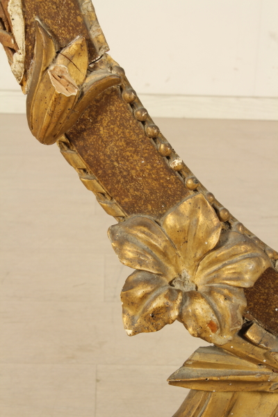 Cornice Neoclassica, ovale sostenuta da volute intagliate poggianti su gradinata architettonica, la cornice presenta intagli a nastro e nella base intagli a canna palustre con fiori e cimasa a ventaglio fogliato. La superficie è marmorizzata a finto porfido rosso e dorata a guazzo nelle parte a rilievo. Nella base è presente una dedica di Yacintha Maresca.