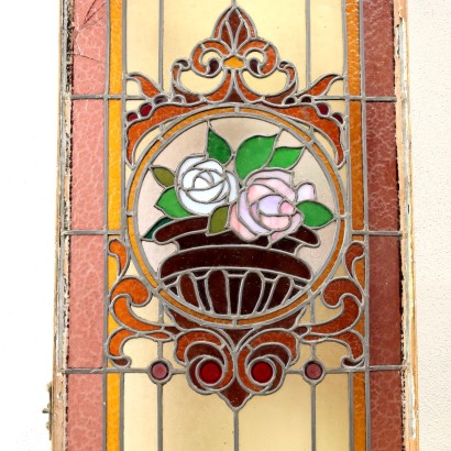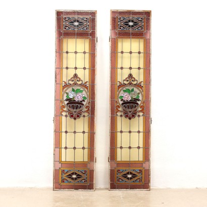 Descrizione Coppia di vetrate liberty in vetro piombato colorato, Italia fine XIX – inizio XX secolo. Decorate a motivi geometrici, fitomorfi e con vaso di fiori centrale.