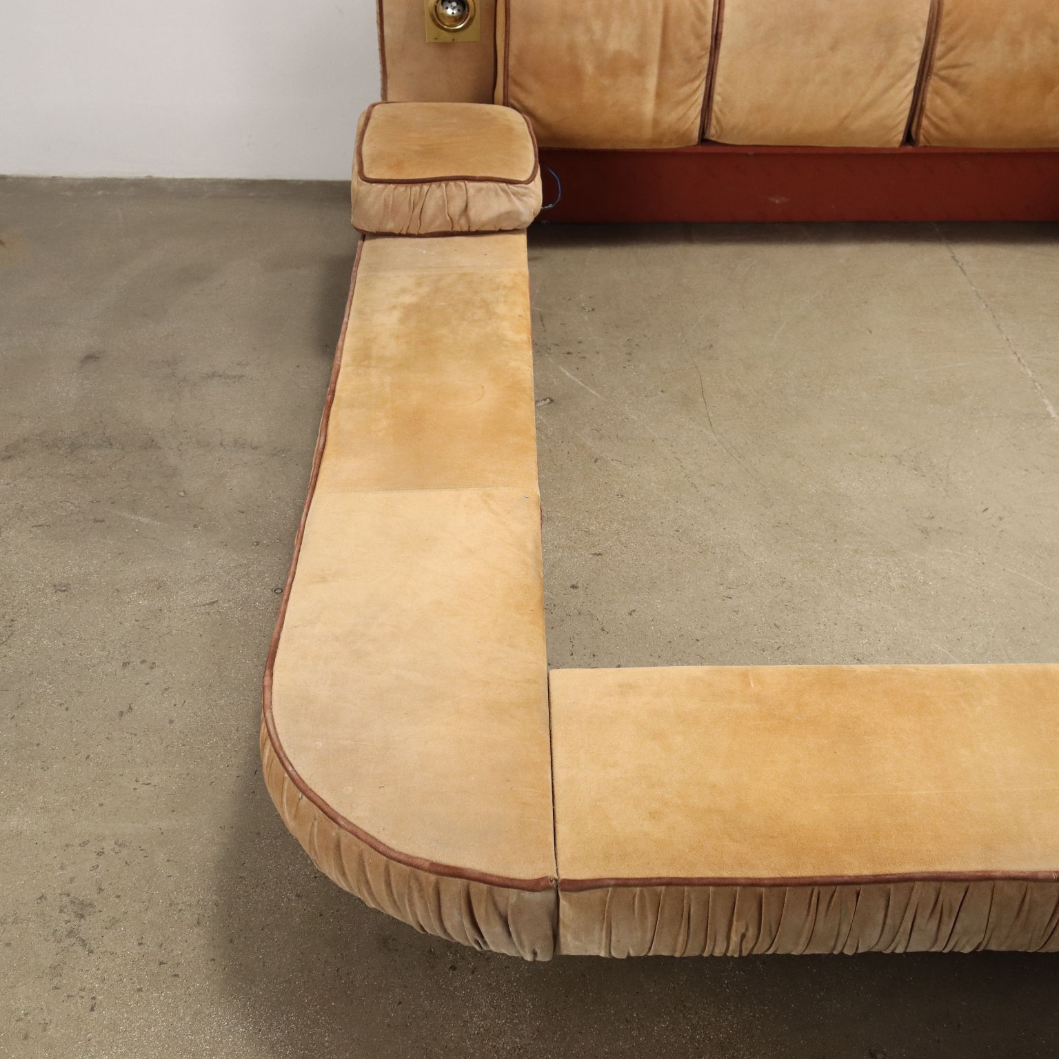 Letto matrimoniale con radio e luci incorporate (non revisionate) struttura imbottita e rivestita con pelle scamosciata, specchio fumè, lamine in alluminio ottonato.