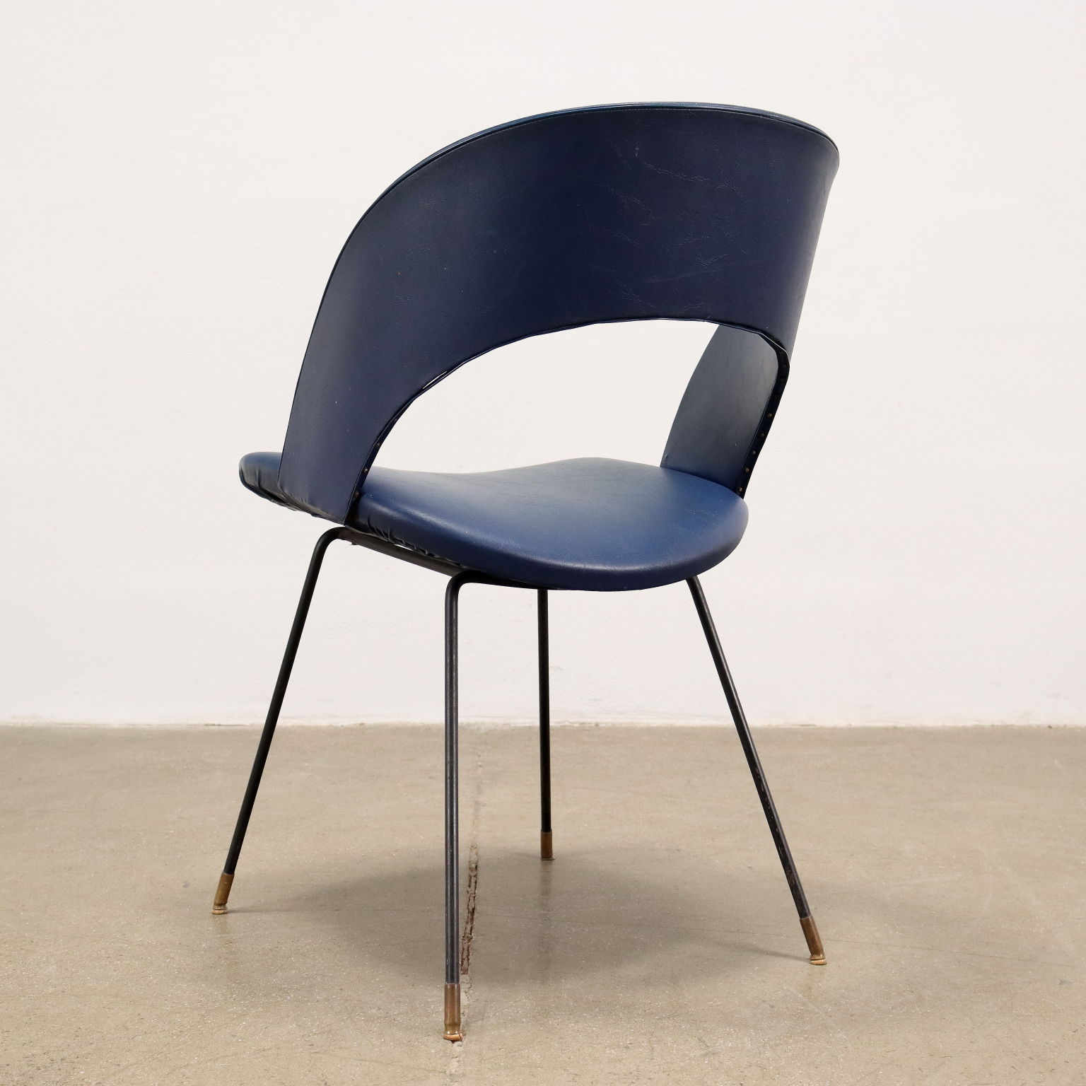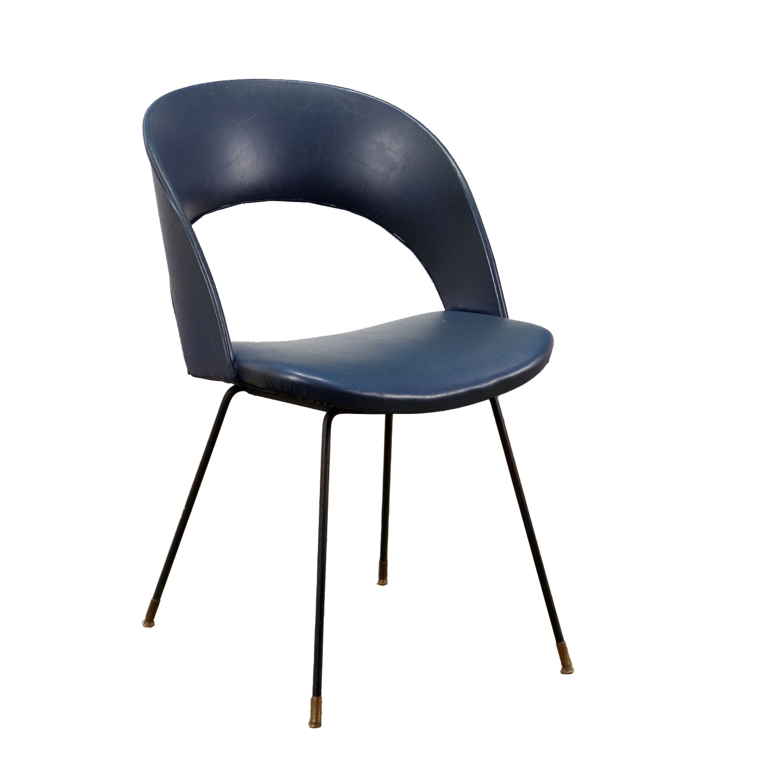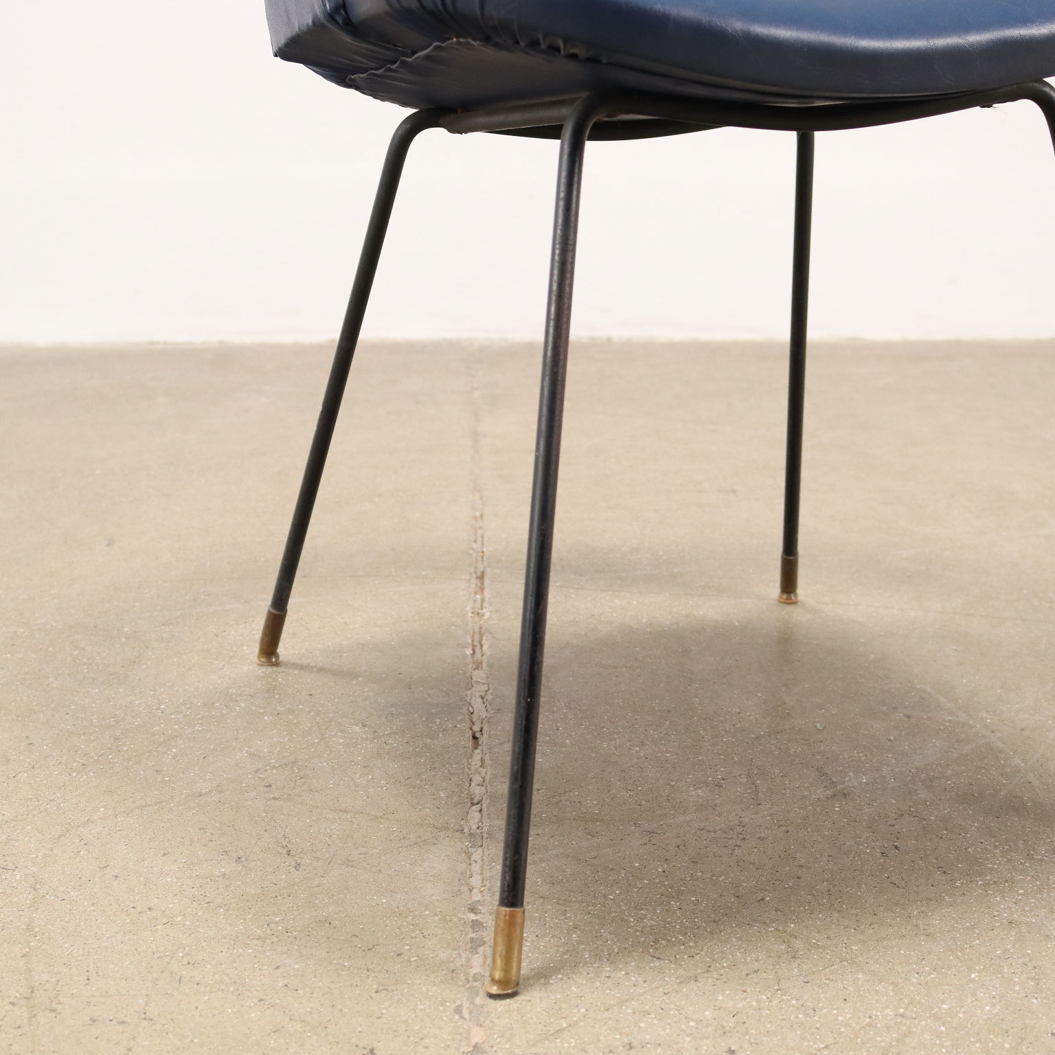 Sedia con base in tondino metallico smaltato con puntali in ottone, imbottitura in espanso, rivestimento in skai.