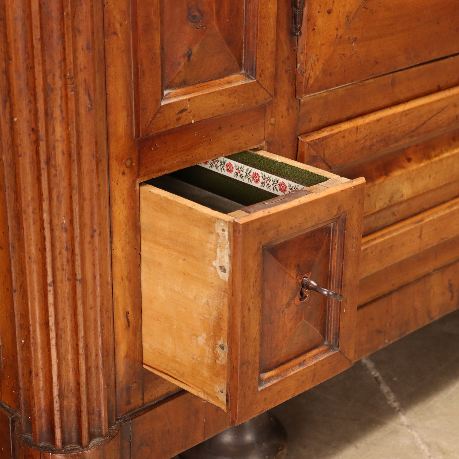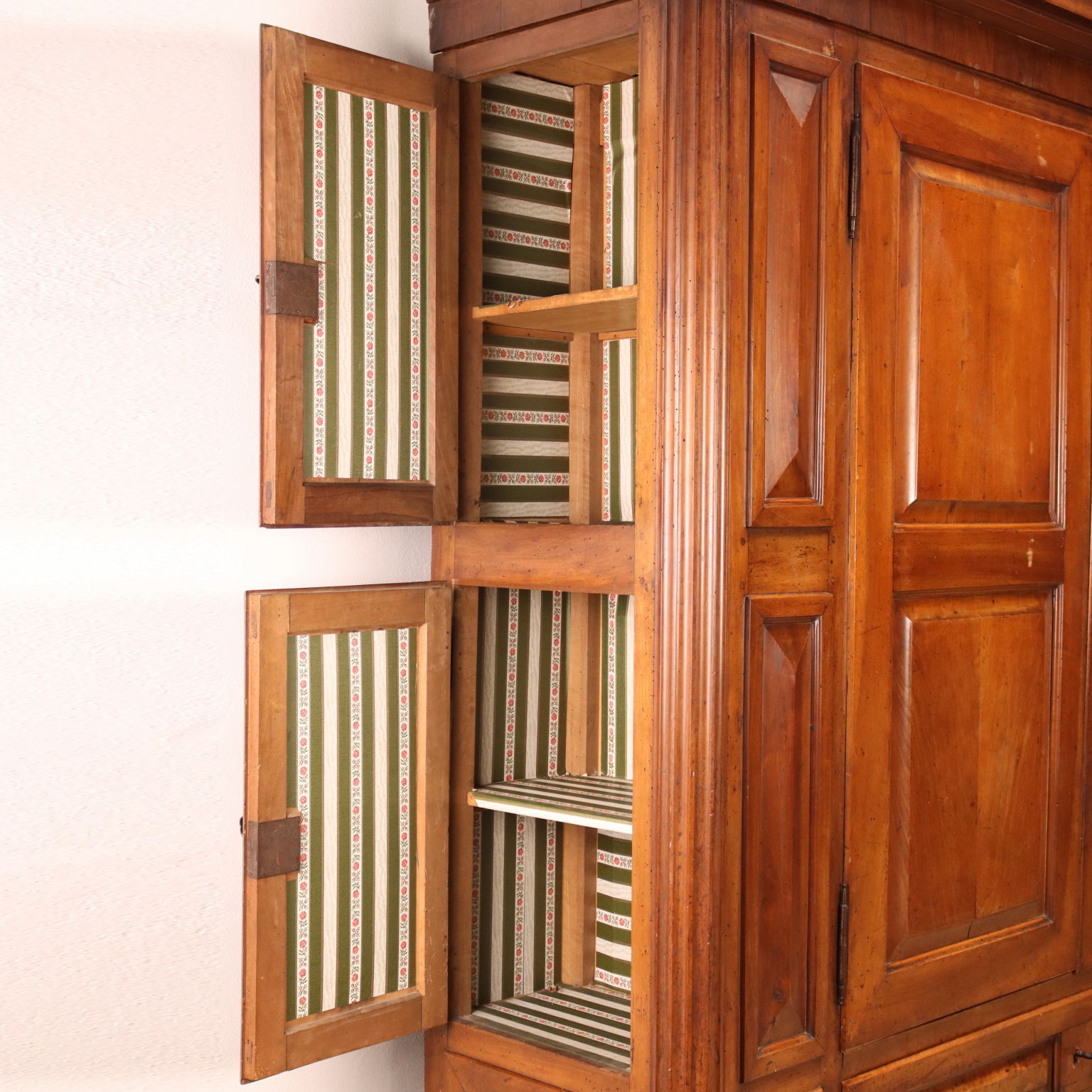 Armadio impero in noce, Italia primo quarto XIX secolo. Cimasa modanata, fronte dotato di coppia di ante e fascia inferiore con 3 cassetti, sui montanti colonne rastremate, lati ospitano 4 vani dispensa, piedi torniti. Base e cappello sono raccordati da viti lignee strette dai piedi. Ornato da riserve intagliate e disposte entro corniciature. Interni noce e pioppo.