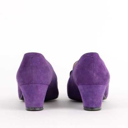 Eleganti scarpe scamosciate viola, misura 38, tacco 4 cm, databili anni '60 circa. Sono di alta fattura artigianale; buonissime condizioni ma non perfette, perché sono state conservate benissimo, ma comunque utilizzate.