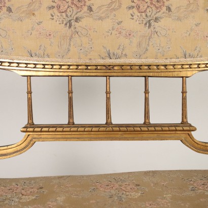 Divanetto in stile neoclassico in legno intagliato e dorato, Italia XX secolo. Abbellito da greche, scanalature, motivi fogliacei e a nastro; gambe troncoconiche con piedi a pera. Schienale, braccioli e seduta imbottiti e rivestiti con tessuto a tema floreale ricamato.