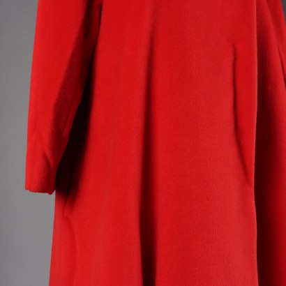 Cappotto caldo in morbida lana rossa, monopetto, chiusura a un bottone dorato. E' foderato in viscosa e in condizioni molto buone. Non ha il cartellino con la taglia, ma può essere indossato dalla 42 fino alla taglia 48 italiana, essendo un modello dalla linea morbida. (lunghezza cm 100, spalla raglan con lunghezza manica cm 68, girovita cm 152, torace cm 122).,
