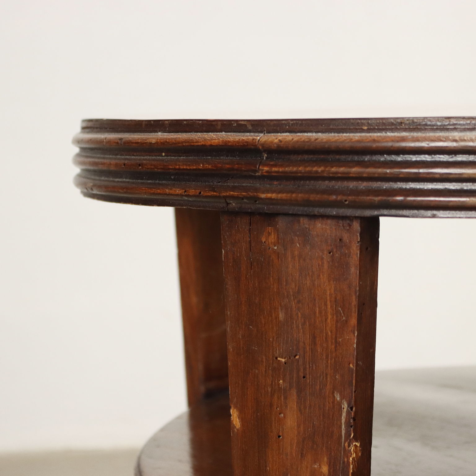 Tavolino da centro con doppio piano, in legno di faggio tinto e formica effetto legno sul piano.