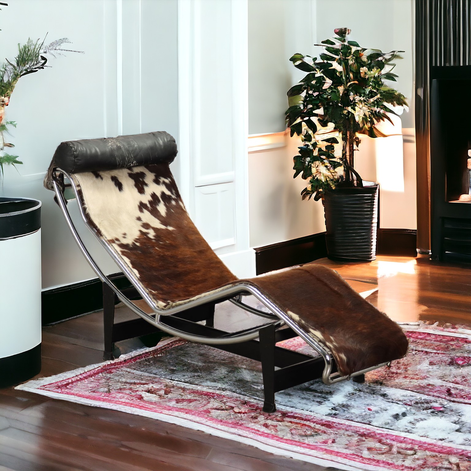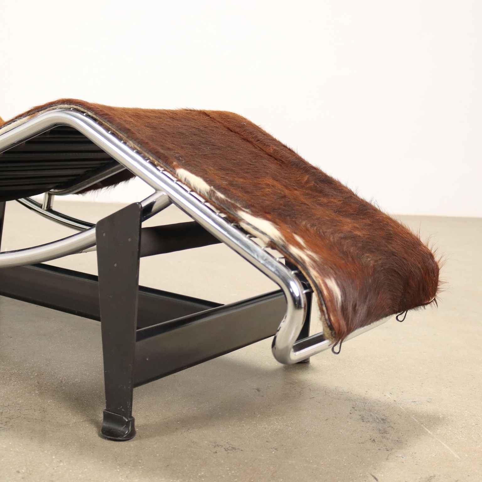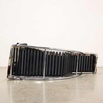 Chaise longue ad inclinazione regolabile con struttura in acciaio e metallo laccato, seduta in cavallino, cuscino di testa in pelle; marchio produzione Cassina sul tubolare.