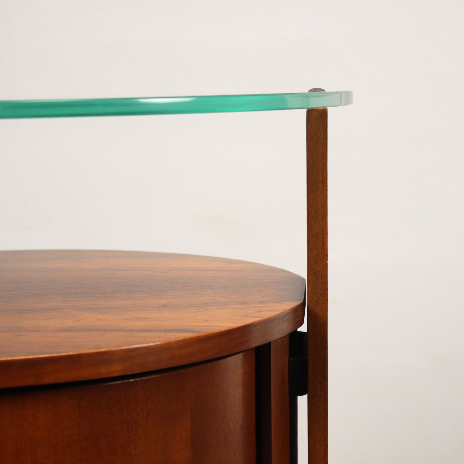 Mobile bar con apertura ad ante scorrevoli, ripiani a giorno, in vetro quello superiore e in legno quello inferiore; legni impiallacciati teak, e legno esotico, base in metallo smaltato.